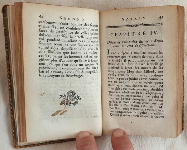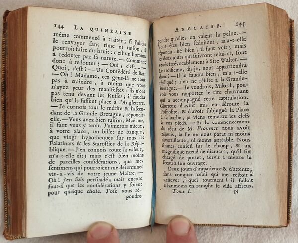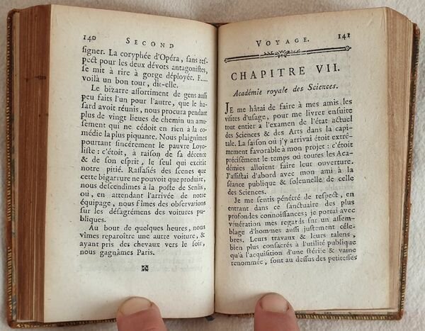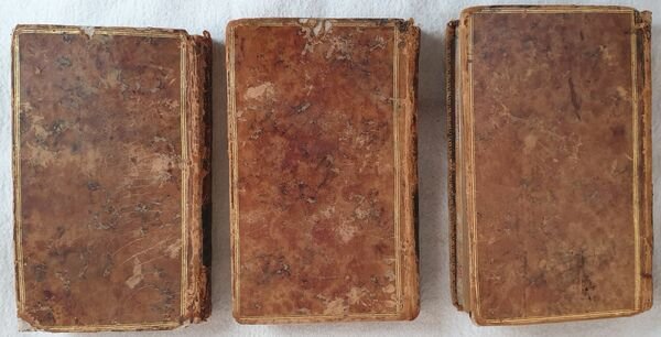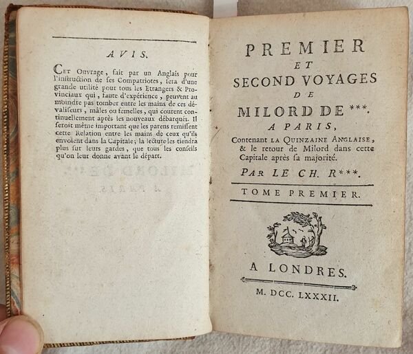 Rarissima edizione pubblicata in forma anonima del 1782 del celebre romanzo scritto dal giovane giacobita Jean Jacques Rutledge (1742-1794) o Sir James Rutledge. L'opera venne pubblicata per la prima volta nel 1776 come "La quinzaine angloise a Paris ou l'art de se ruiner en peu de temps" alla quale seguì la traduzione inglese l'anno successivo "The englishman's fortnight in Paris". Descrive la decadenza di un giovane aristocratico inglese che giunto a Parigi si perde fra prostitute corse di cavalli e alcool per poi finire in prigione per debiti, una vera critica alla società francese del tempo. Questa edizione stampata a Londra senza alcuna indicazione di editore viene pubblicata con il titolo "Premier et second voyages de Milord de.". Composta da tre tomi è completa. In buone condizioni. Copertina in piena pelle coeva con titolo al dorso e filetti in oro ai piatti e unghie in buone condizioni generali con usure ai margini e dorso. Legatura in buone condizioni. Pagine in ottime condizioni con rare fioriture. In 24 cm 12,5x8. Pp. (6)+254, (4)+228, (4)+226.