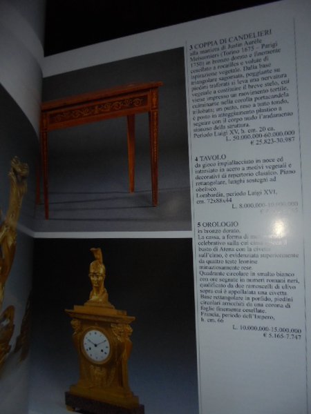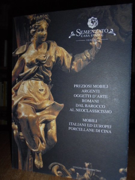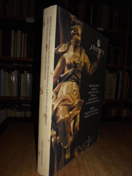 Preziosi mobili argenti oggetti d' arte romani dal Barocco dal neoclassicismo. Mobili italiani ed europei porcellane di Cina. In-4°, tela blu con titoli in oro sul piano e sovracopertina. Asta in Venezia Palazzo Correr, 2001. Con le fotografie a colori e la descrizione di 300 oggetti in vendita più addenda di 40 oggetti. Con i prezzi in lire italiane. Catalogo molto bello e come nuovo. Neg. mob. 17