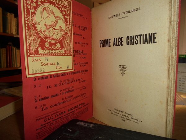 Raffaele, Ottolenghi. Mendrisio, Casa Editrice << Cultura Moderna >>, 1914. Prime Albe Cristiane. In-8° piccolo, br. orig. 314, (1) pp. Ben conservato con barbe. Neg. mob. nero sopra 10