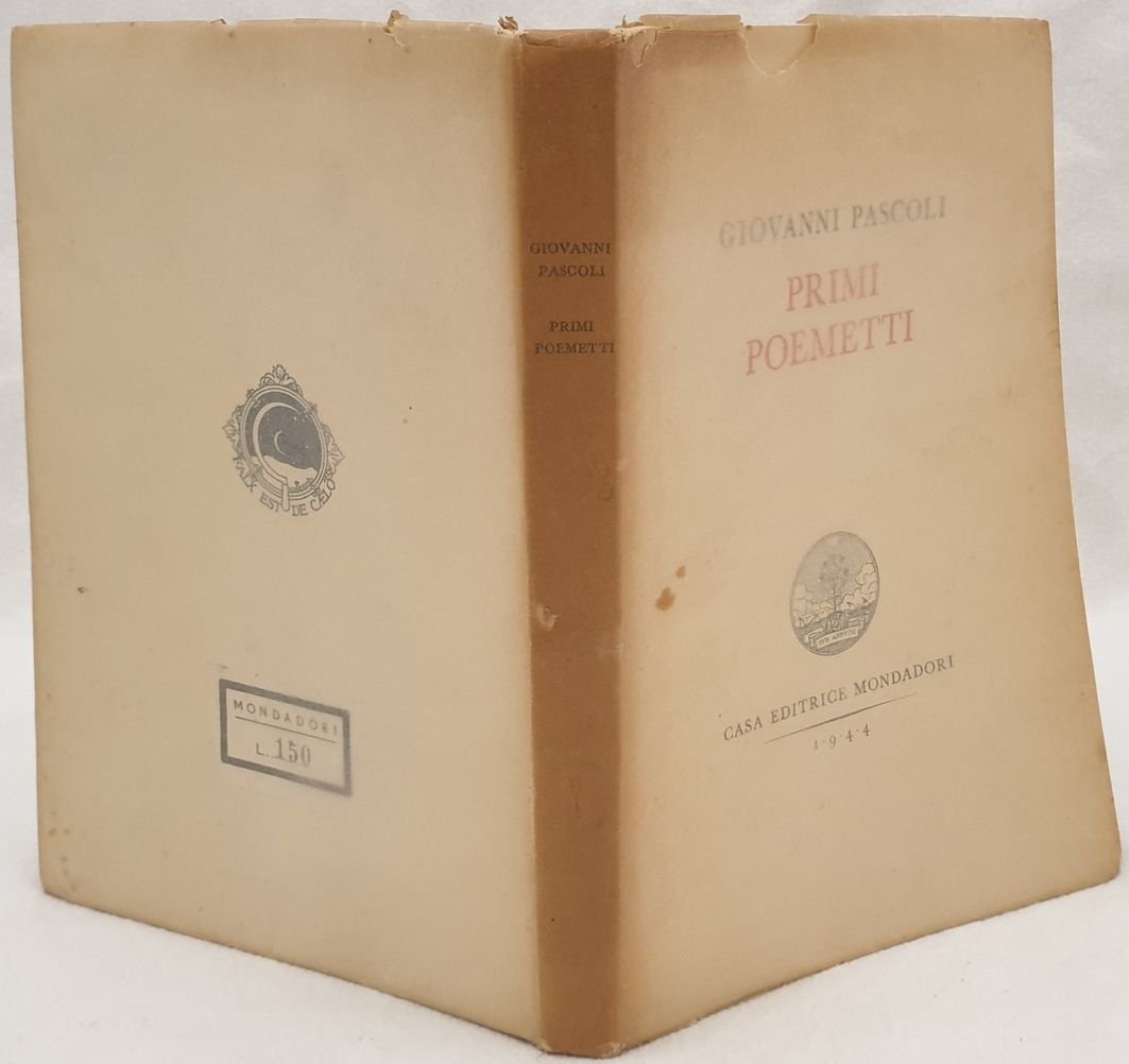 Edizione del 1944 di questa raccolta poetica del poeta italiano Giovanni Pascoli (1885-1912) "Primi poemetti". In ottime condizioni, presente perfino foglietto pubblicitario della Mondadori. Copertina editoriale con carta protettiva in buone condizioni generali con lievi usure ai margini e dorso. Legatura in buone condizioni. Pagine in ottime condizioni con rare fioriture. In 8. Dim. 23,5x17 cm. Pp. XVII+(3)+196+(8). Edition of 1944 of this collection of poems by the italian poet Giovanni Pascoli (1885-1912) "Primi poemetti". In very good conditions there is even the advertising page of Mondadori. Editorial cover with protective paper in good general conditions lightly worn in the extremities. Binding in good conditions. Inside pages are in very good conditions with occasional foxings. In 8. Dim. 23,5x17 cm. Pp. XVII+(3)+196+(8).