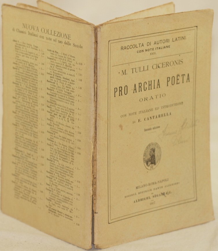 In 8. Dim. 19,5x13 cm. Pp. 81+(1). Edizione del 1917 di questa orazione scritta da Marco Tullio Cicerone in difesa di Aulo Licinio Archia, un poeta accusato di usurpazione della cittadinanza romana. Testo latino con note italiane ed introduzione di F. Cantarella. Note manoscritte. In discrete condizioni e completo. Copertina editoriale in discrete condizioni generali con usure e parti mancanti ai margini e dorso. Legatura in discrete condizioni con rotture. All'interno le pagine si presentano in buone condizioni con fioriture. Edition of 1917 of this oration written by Marco Tullio Cicerone in defence of Aulo Licinio Archia, a poet accused of usurpation of roman citizens Latin text with italian notes and introduction by F. Cantarella. Handwritten notes. In fair conditions and complete Editorial cover in fair general conditions with wearings and missing parts in the edges and spine. Binding in fair conditions with cracks. Inside pages are in good conditions with foxings.