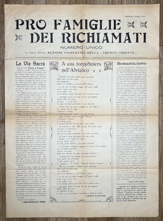PRO famiglie dei richiamati. Numero unico. A cura della sezione fiorentina della "Trento - Trieste". Firenze, 6 giugno 1915.