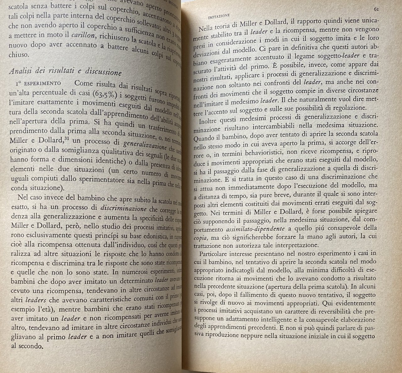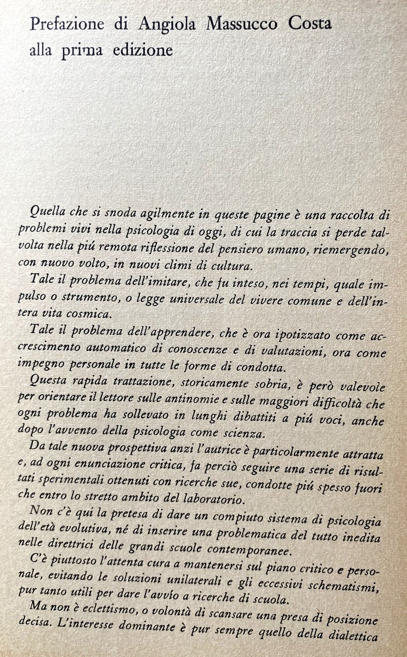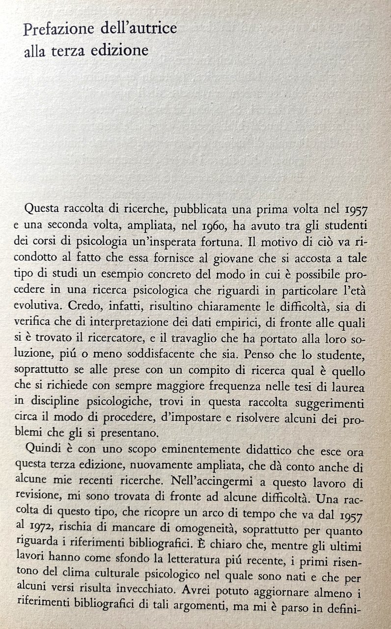 L'autrice pone in questo libro alcuni problemi che sono particolarmente vivi nella psicologia di oggi e che hanno ripercussioni nel campo pedagogico e applicativo. Gli studi che compongono il volume sono caratterizzati dall'esigenza di evitare gli eccessivi schematismi e di considerare i problemi della persona singola in un'ampia prospettiva in cui forze esterne e interne stano dinamicamente interagenti. Alcuni del temi presentati, quali quello dell'imitazione, sono stati oggetto di studio fin dagli inizi della psicologia scientifica e il loro evolversi viene passato in rassegna; altri, come quelle della stereotipia, della frustrazione, della comunicazione, rientrano nel campo d'indagine della più recente psicologia sociale. La raccolta ha uno scopo eminentemente didattico, di fornire cioè agli studenti del corsi di psicologia un esempio concreto del modo in cui è possibile procedere in una ricerca che riguardi in particolare l'età evolutiva. Essa rispecchia, per un verso, la necessità di uscire dallo stretto ambito dei laboratorio per riscoprire i problemi dell'integrazione umana, della vita di gruppo, delle istanze educative, e per l'altro l'esigenza, per la psicologia, di acquistare coscienza del suo significato sociale e politico.