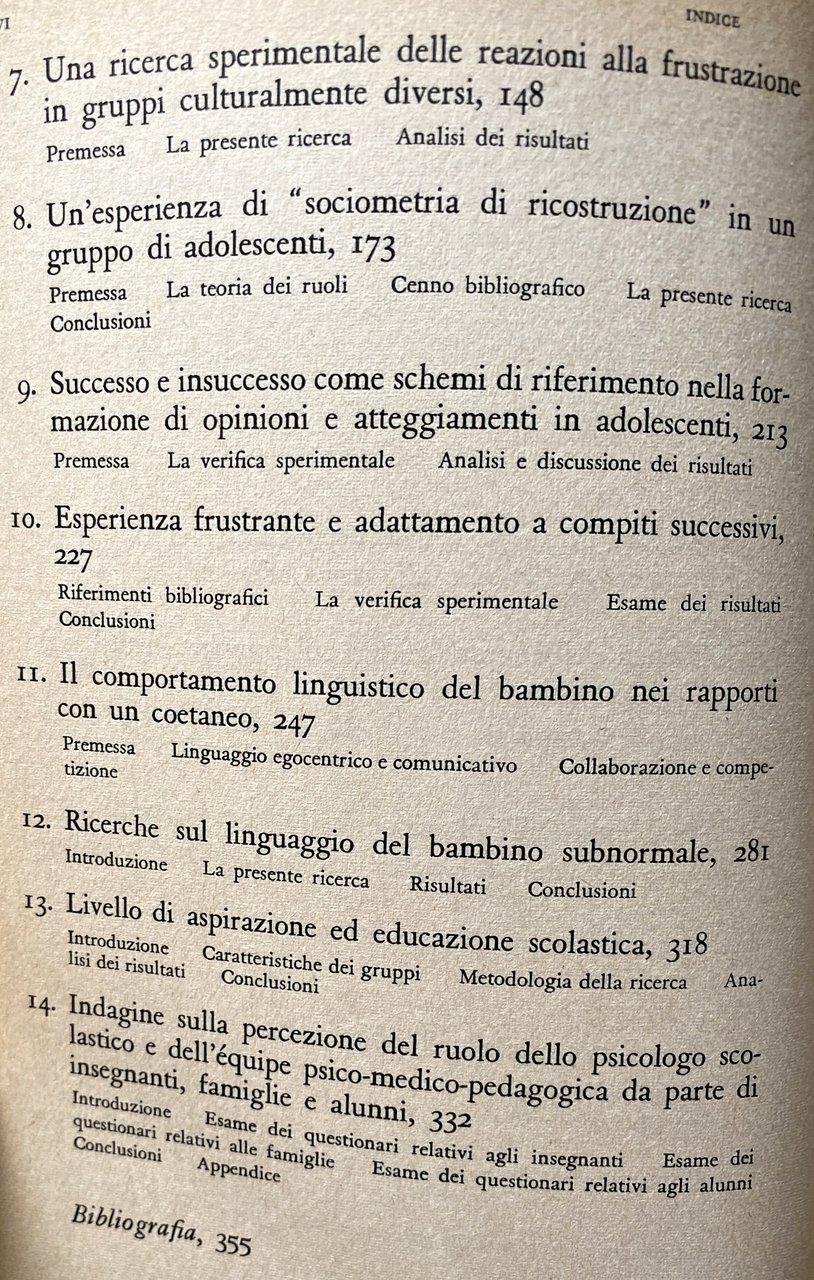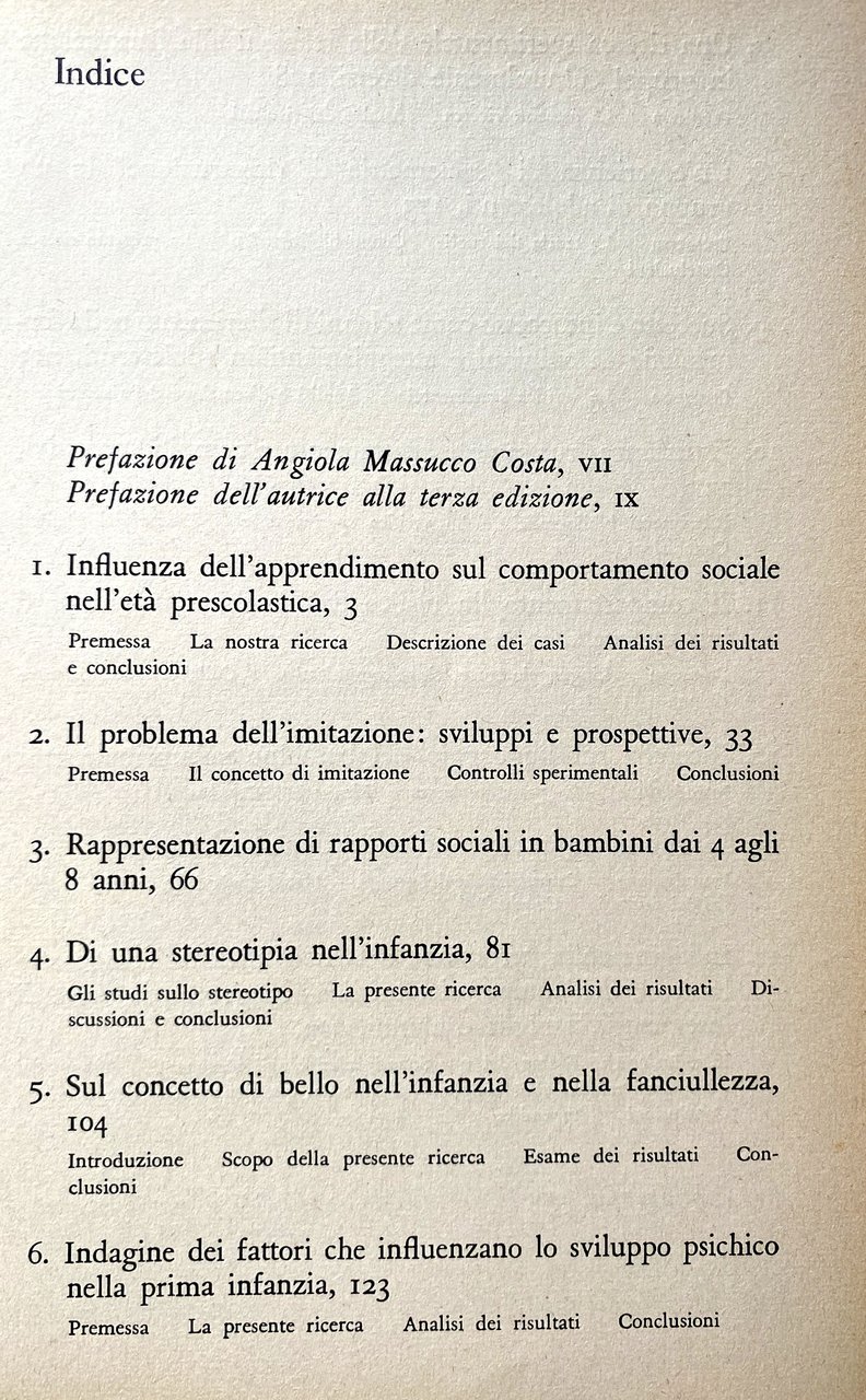 Soggetti: Psicologia evolutiva infantile Infanzia Bambini Manuali Classici Testi universitari Personalità Scienze sociali Fanciulli Comportamento sociale Didattica Lezioni Ricerche sperimentale Studi comportamentali Interazioni sociali Imitazione Adulti Genitori Famiglia Crescita Sviluppo psichico Pregiudizio Frustrazione Apprendimento Comunicazione grafica verbale Segni Psicoterapia clinica Psichiatria Scuola Età prescolastica Relazioni sociali Quattro Otto anni Stereotipi Concetto di bello Estetica Riconoscimento Armonia Volti Bellezza Influenze culturali Modelli Analisi Indagini Test Risultati Gruppi Sociometria Adolescenti Adolescenza Teorie Ruoli Opinioni Pensiero Autonomia Atteggiamento Adattamento Gioco Giochi Coetanei Linguaggio Competizione Collaborazione Amicizia Egocentrismo Subnormali Disabilità Aspirazioni Educazione scolastica Pedagogia Maestri Scuole Insegnanti Nonni Famiglie équipe psico-medico-pedagogica Psicologo scolastico Questionari Appendici Valutazione Condotta Dialogo Dialettica Vita di gruppo Possessività Reazioni Norme sociali Bibliografia Libri Vintage Fuori catalogo Petter Kohler Gestalt Anni Cinquanta Sessanta Settanta Buhler Intelligenza Latenza Regressione Differenziazione Pregiudizi razziali Terry Prothro Bruttezza Buoni Cattivi Belli Brutti Immagini femminili Ferretti Differenze di genere Balbettamento Balbuzie Istinto Socialità Abitudini Acquisizioni Transfert Inconscio Guillaume Baldwin Ritardo mentale Aggressività Apatia Ansia Nevrosi Disturbi psichici Anormalità Dipendenza Inappetenza Capricciosità Indocilità Instabilità Schematismi Lippmann Vygotsky Vygotskij Piaget Maria Montessori Lewin Meyer Miotto De Benedetti Zazzo Goldstein Anna Freud Katz Keister Nencini Meschieri Ponzo Zaccagnini Canestrari Adorno Scheerer Wallon Dollard Cooper Singer Postman Bruner Holt Durkheim Dewey Claparède Isaacs Childhood Evolutionary Psychology Children Manuals Classics University Texts Personality Social Sciences Social Behavior Teaching Lessons Experimental Research Behavioral Studies Social Interactions Imitation Adults Parents Family Growth Psychic Development Prejudice Frustration Learning Graphic verbal communication Signs Clinical psychotherapy Psychiatry Preschool age Social relations Four Eight years Stereotypes Beautiful concept Aesthetics Recognition Harmony Faces Beauty Influences Cultural Models Analysis Surveys Results Groups Sociometry Adolescents Adolescence Theories Roles Opinions Thinking Autonomy Attitude Adaptation Games Peers Language Competition Collaboration Friendship Self-centeredness Subnormal Disabilities Aspirations School education Pedagogy Teachers Grandparents Families School psychologist Questionnaires Appendices Evaluation Conduct Dialogue Dialectics Group life Possessiveness Reactions Social norms Bibliography Out of print books Fifties Sixties Seventies Intelligence Latency Regression Differentiation Racial prejudices Ugliness Good Bad Beautiful Ugly Female images Underwire Gender differences Stammering Stuttering Instinct Sociality Habits Acquisitions Unconscious Mental retardation Aggression Apathy Anxiety Neurosis Psychic disorders Abnormality Dependence Loss of appetite Capriciousness Indocility Instability Schematic Collectibles Collezionismo