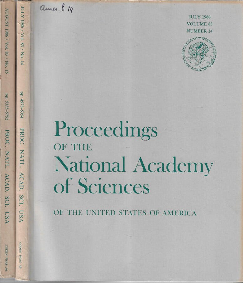 Due tomi del volume 83 numeri 14 e 15 dei "Proceedings of the National Academy of Sciences of the United States of America" rispettivamente dei mesi di luglio ed agosto 1986. Brossure minimamente ingiallite dal tempo presentanti leggeri segni di usura da scaffale ai margini con abrasioni agli stessi, lievi tracce di usura da sfregamento ai piatti e segno a biro al piatto anteriore di ogni tomo. Pagine godibili anche se leggermente ingiallite dal tempo in particolare ai tagli. I volumi potrebbero contenere timbri ed etichette dell'Istituto Veneto, regolarmente acquisiti dalla nostra libreria. Numerazione delle pagine consecutiva tra i volumi dalla 4973 alla 5752. Numero pagine complessive 779.