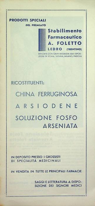 Prodotti speciali del premiato stabilimento farmaceutico A. Foletto: Ledro (Trentino): ricostituenti: china ferruginosa, arsiodene, soluzione fosfo-arseniata.