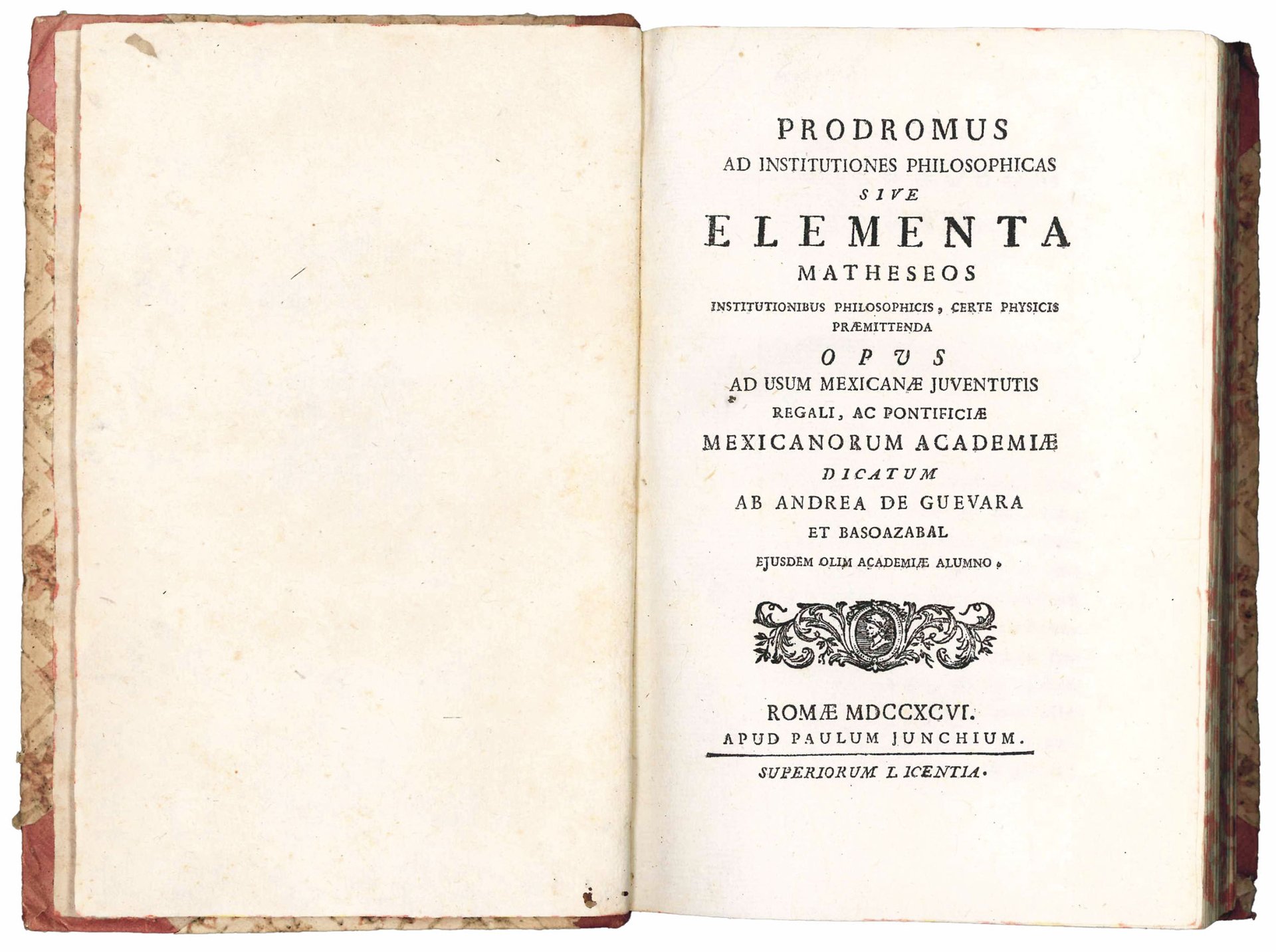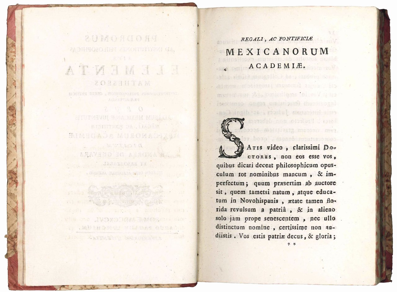 Rare first edition of this publication of which two other issues are known, one bearing a different title and having three plates signed by Antonio Gregori. In the approbation and in the signature of the quires the book is designated as “tomus primus”, as it was meant to be the introductory volume to Guevara y Basoazabal's major work, the Institutionum elementarium philosophiae ad usum studiosae juventutis, which he published in three volumes in Rome between 1796 and 1798. The Prodromus, which opens with a dedication to the professors of the University of Mexico, here defined as “Regalis ac Pontificia Mexicanorum Academia”, contains a short history of philosophy (De Philosophiae vicissitudinibus brevis narratio), followed by a treatise on mathematics, geometry, and trigonometry.