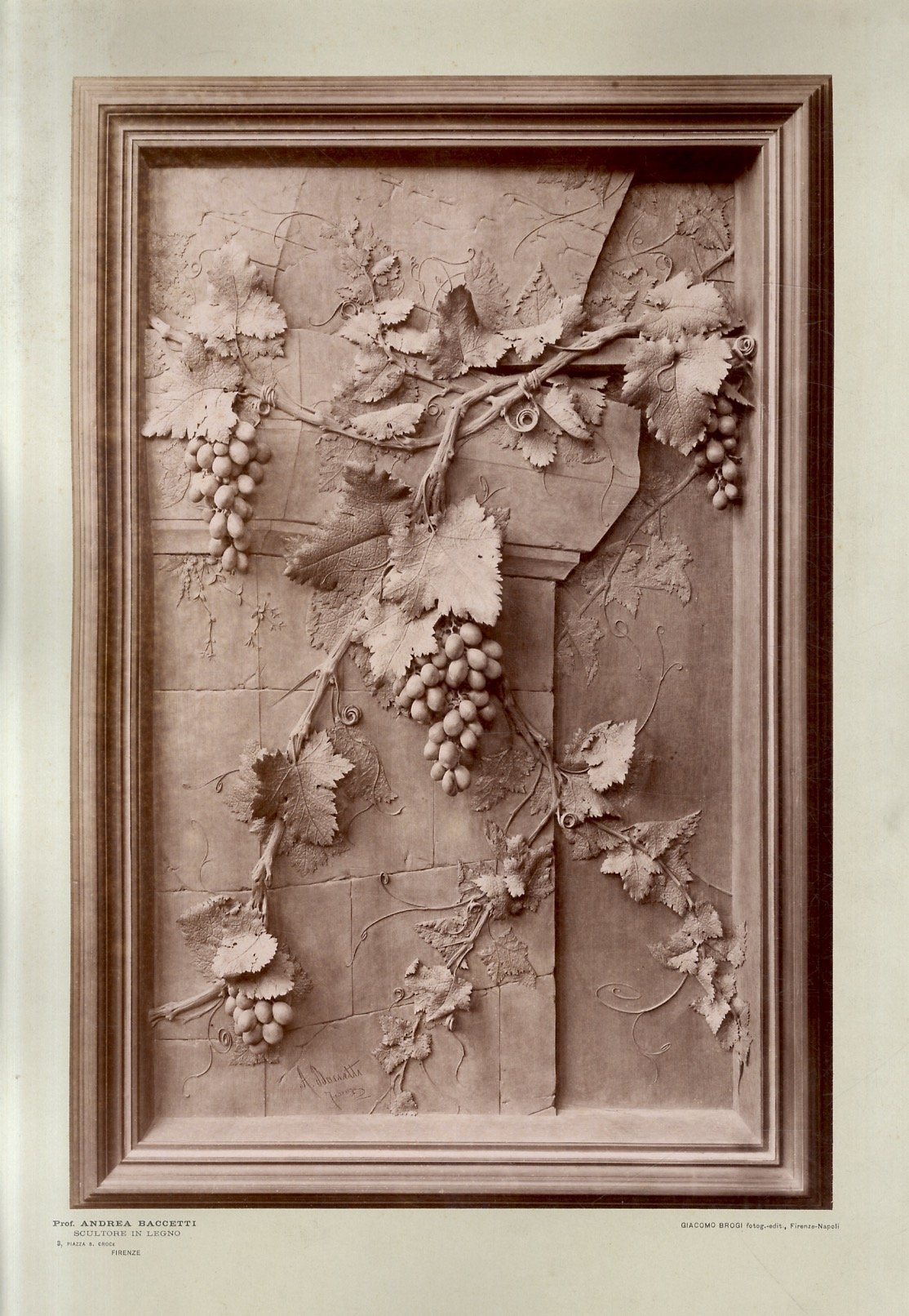 Firenze, Giacomo Brogi, [primi del '900], lotto di 5 grandi fotografie originali raffiguranti lavori del Baccetti; misure mm. 365x250 circa, applicate su cartoncini di mm. 500x390. Due sono firmate e intitolate sul margine inferiore del cartoncino, le altre hanno chiaramente la stessa provenienza e simili soggetti. Il lotto: