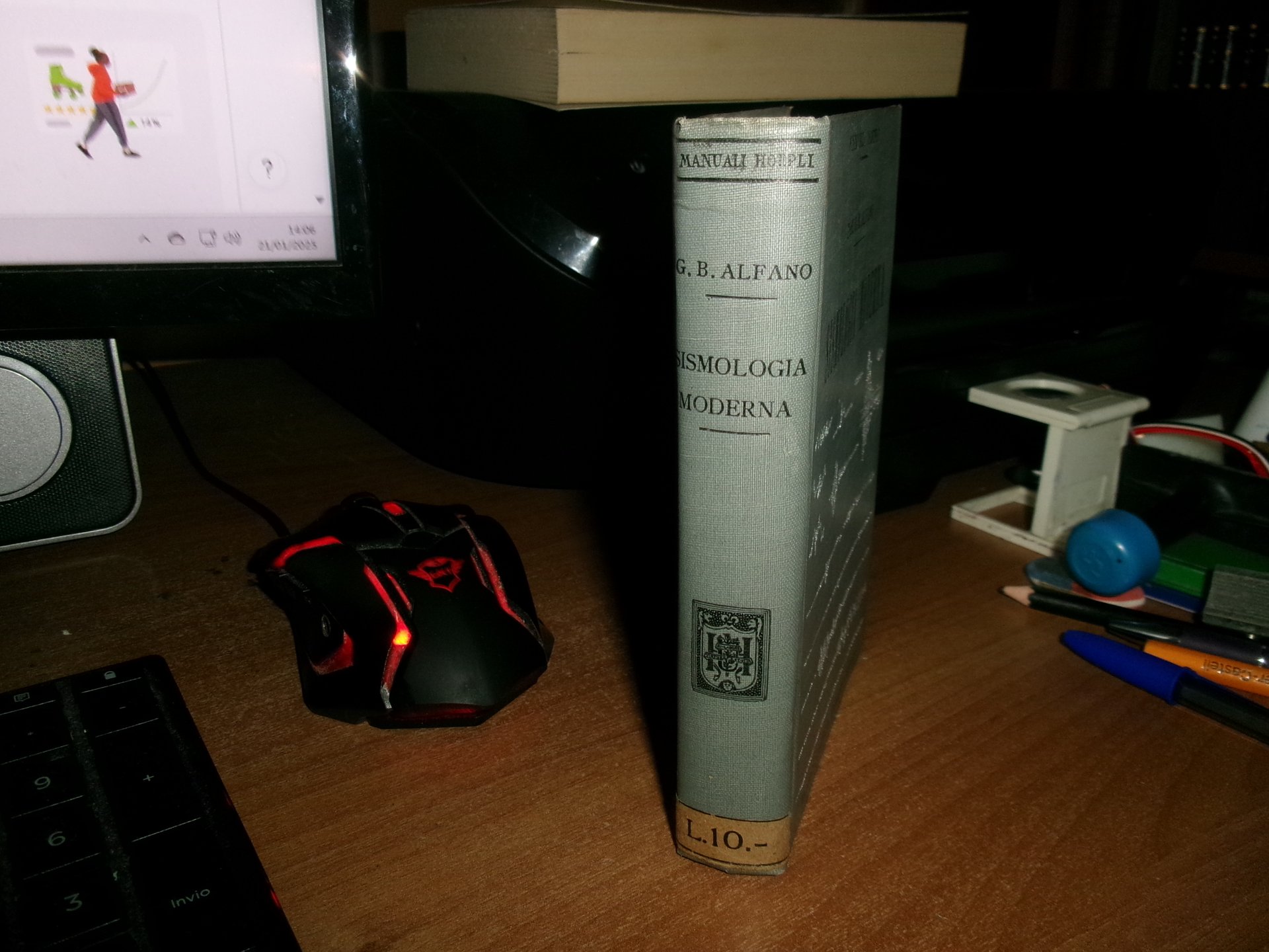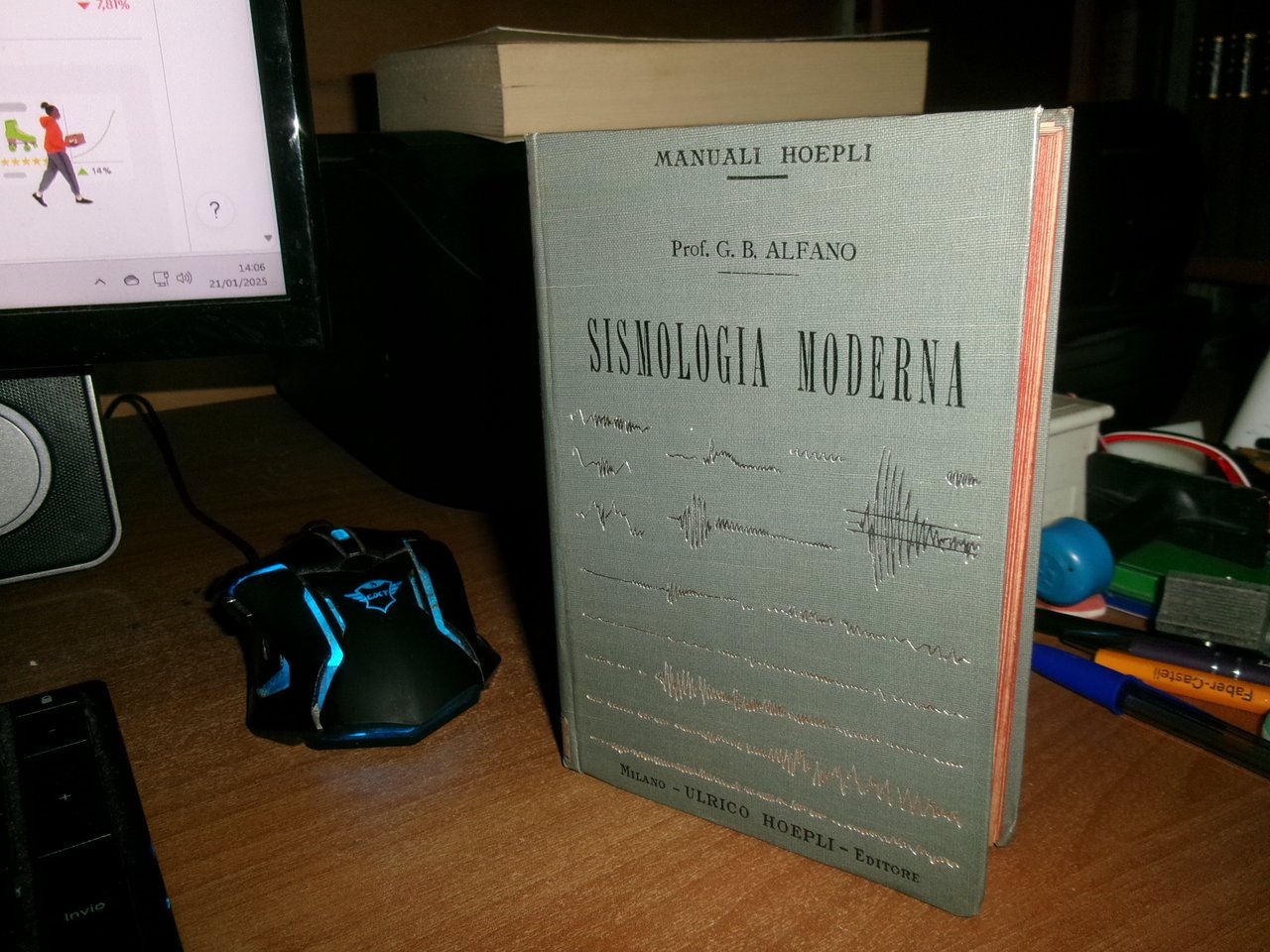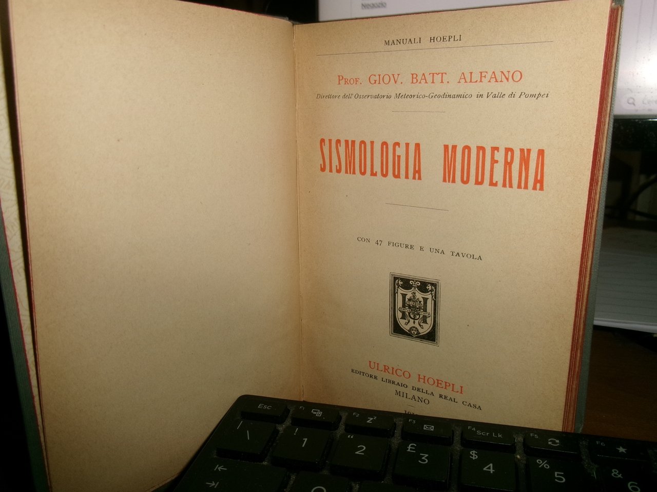 Prof. G. B. ALFANO. SISMOLOGIA MODERNA. Milano, Ulrico Hoepli, 1910. In-16°, tela edit., tagli colorati in rosso. 357 pp. con 47 figure e una tavola + 64 pp. (catalogo Hoepli). Ottimo stato. Neg. Hoepli mob. 19