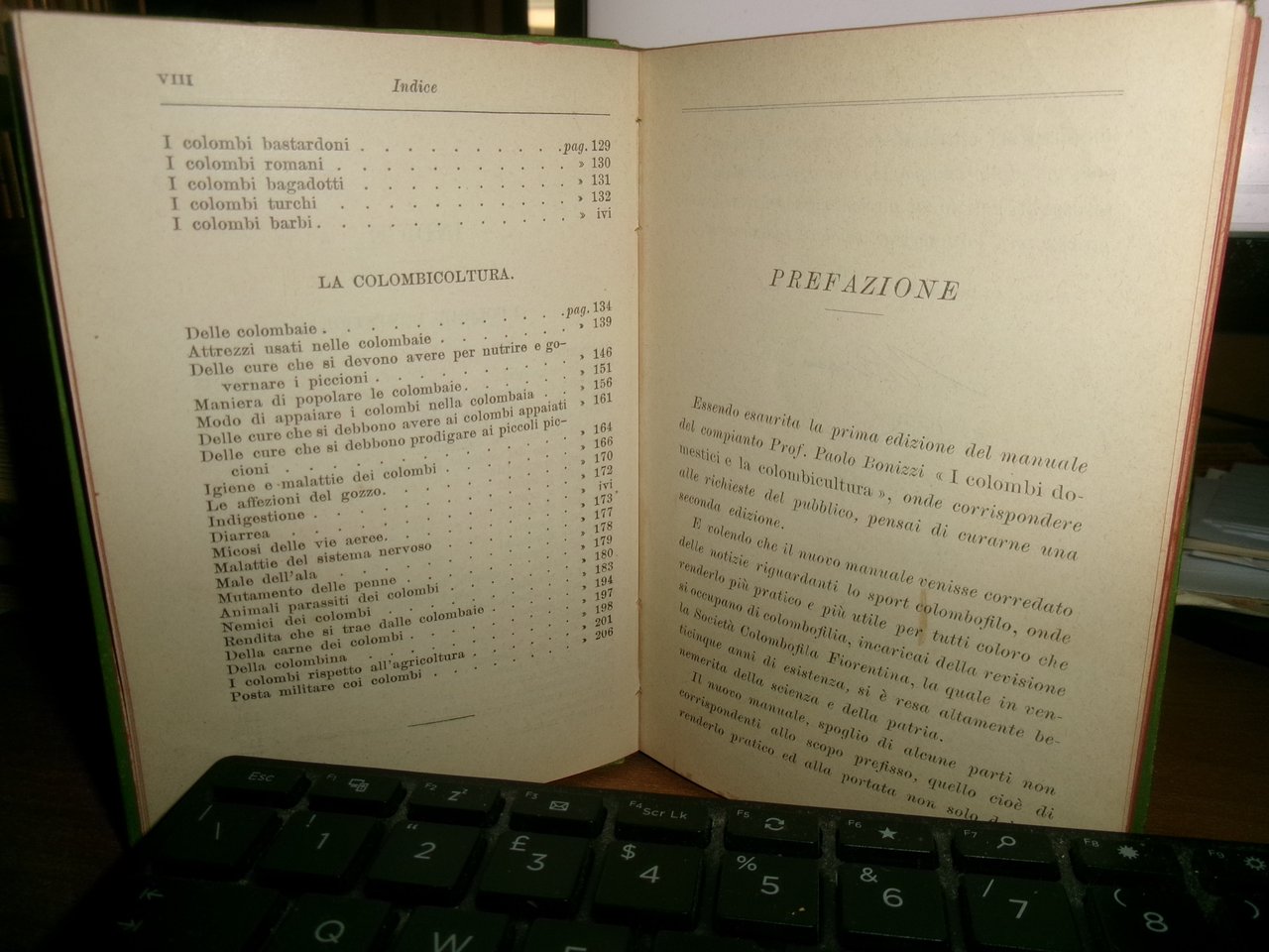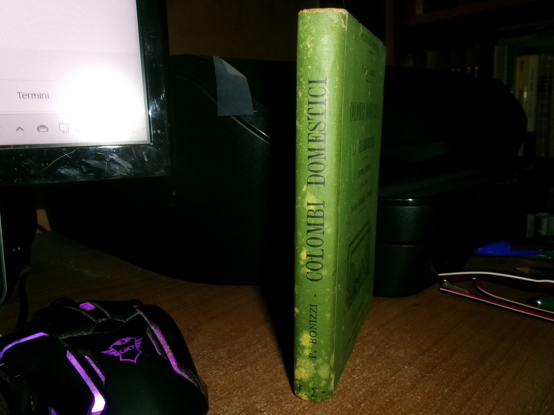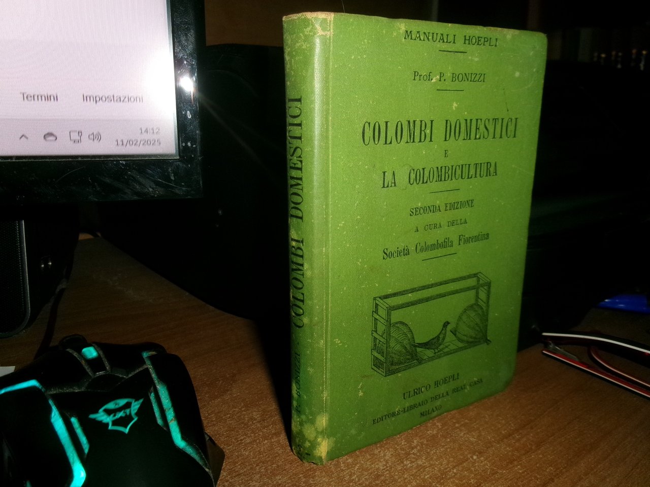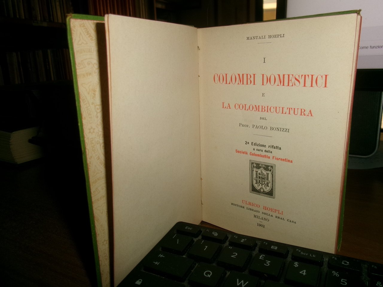 Prof. P. BONIZZI. COLOMBI DOMESTICI e LA COLOMBICULTURA. Seconda Edizione a cura della Società Colombofila Fiorentina. In-16°, tela verde edit. , tagli in rosso. x, 211 pp. con 26 figure n.t. + 64 pp. del catalogo di 800 Manuali Hoepli Lieve scoloritura al dorso ma libro molto ben conservato. Neg. scat. ultimi Hoepli.