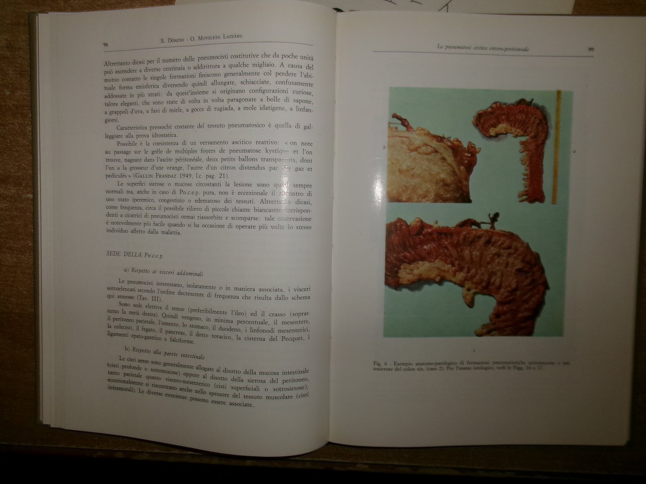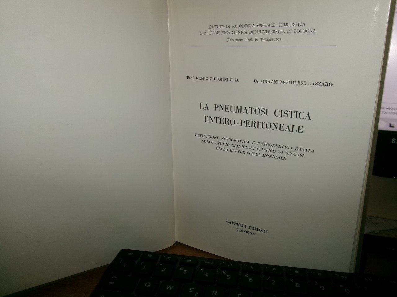 Prof. Remigio Dòmini . Orazio Motolese Lazzàro. Bologna, Cappelli Editore, 1963. LA PNEUMATOSI CISTICA ENTERO-PERITONEALE. Definizione Nosografica e Patogenetica basata sullo studio clinico-statistico di 709 casi della letteratura mondiale. In-8°, cartonato edit. viii, 200 pp. con numerose illustrazioni anche a colori n.t. Ottimo stato con dedica firmata dall' autore al Dott. Prof. BRUNO MAGNANI. Uff. stanz. sinistra II - 2