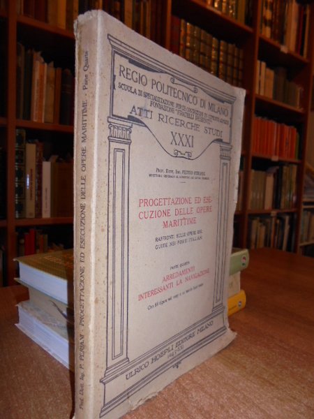 Prof. Dott. Ing. Pietro, Periani. Milano, Ulrico Hoepli Editore, 1943. Progettazione ed esecuzione delle opere marittime. Raffronti sulle opere eseguite nei porti italiani. Parte quarta: Arredamenti interessanti la navigazione. In-8°, br. orig. 249 pp. con 88 figure nel testo e 11 tavole ripiegate fuori testo. In buono stato di conservazione. (parzialmente intonso), Neg. man. Hoepli.