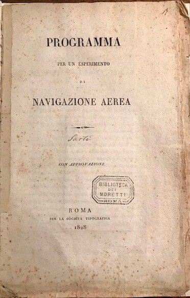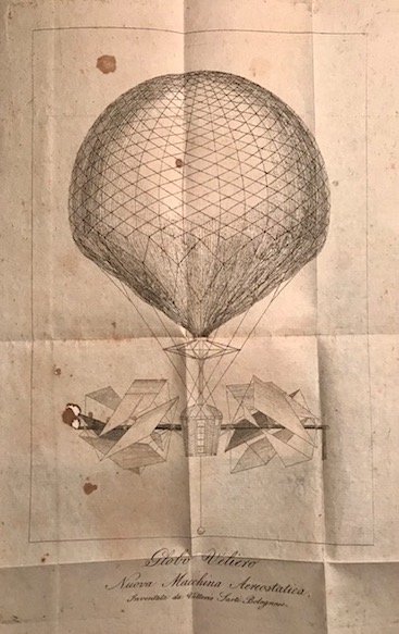 8vo (cm. 23), 8 pp. Con una tavola calcografica più volte ripiegata in fine (’Globo Veliero. Nuova macchina aereostatica inventata da Vittorio Sarti bolognese’). Risulta assente una tavola a stampa citata nelle bibliografie con ‘L’invito dell’inventore ad assistere all’ascensione.’ (forse non presente in tutti gli esemplari?). Cartoncino muto. Lievi arrossature, peraltro ottimo stato di conservazione. Provenienza: Collezione Moretti, Roma (timbretto ex libris al frontespizio). Rarissimo opuscolo non censito in ICCU.