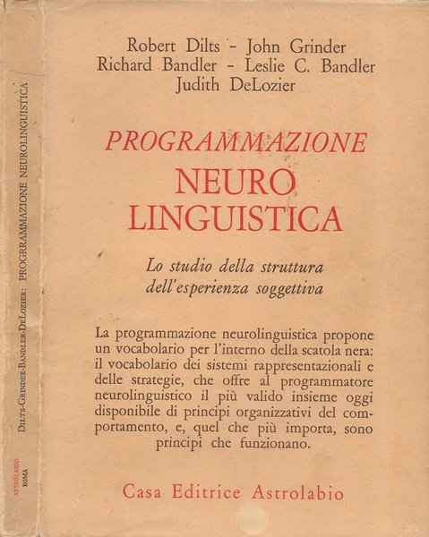 Coperta in buono stato, così come le pagine, sovraccoperta lievemente imbrunita e con segni d'usura ed irregolarità da fattore tempo, libro completamente fruibile, appartenente alla collana "Psiche e Coscienza", autori: Robert Dilts, John Grinder, Richard Bandler, Leslie C. Bandler, Judith DeLozier, con prefazione degli autori, presentazione all'edizione italiana di Carlo Moiso e Michele Novellino, traduzione di Augusto Menzio, numero pagine 259; da segnalare: alcune pagine con sottolineature a matita e parti di testo evidenziate a colori USATO