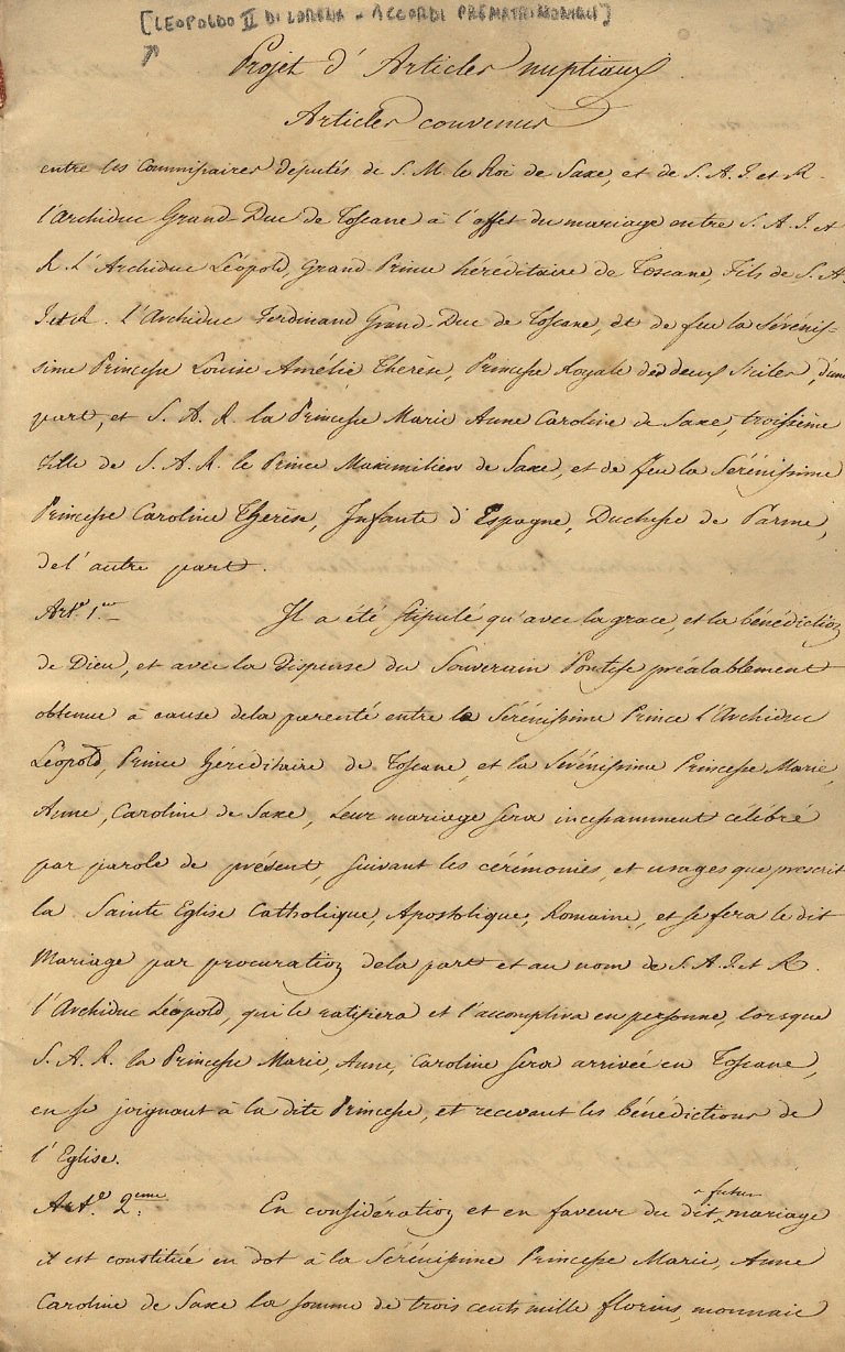 (In fine: Faites a Dresde, [s.d., ma prob. Firenze, prima metà dell'800]), in-4, manoscritto a penna su carta, in lingua francese, in chiarissima grafia, nato senza brossura, legato con un cordoncino in seta al dorso, pp. [12]. Contiene i 18 articoli dell'accordo prematrimoniale fra le famiglie di Leopoldo II di Lorena, futuro granduca di Toscana e Maria Anna Carolina di Sassonia. Si tratta probabilemnte d'una copia tarda del documento (c. 1830, il matrimonio è del 1817). Il documento non reca alcuna firma. In ottime condizioni, e di buon interesse documentario.