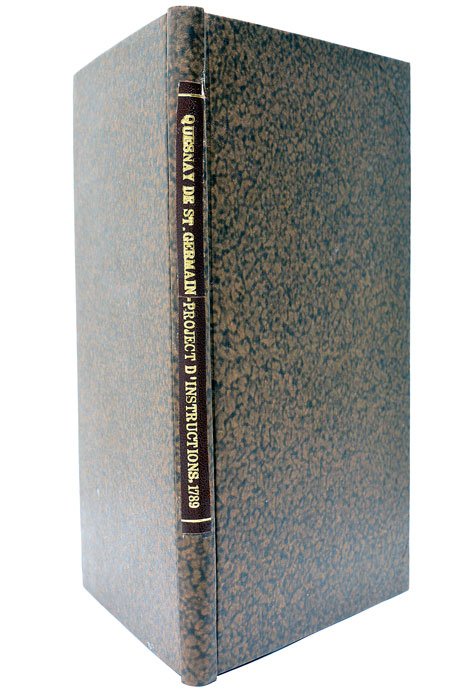 74 pages. 1 feuillet. (20x13 Cm). Cartonnage moderne. Titre doré au dos. Rare recueil de réformes démocratiques et libérales (liberté de la presse, abolition des privilèges, suppression des maitrises et jurandes, liberté du commerce, réforme des impôts, liberté pour les Colonies, etc). Fruit de "vingt années d'études" l'auteur offre ce travail à la réflexion du Tiers Etat à la veille des Etats-Généraux. Quesnay de St. Germain était le petit-fils de François Quesnay, le fondateur de la doctrine physiocratique. Il avait fait partie du ministère de Turgot. Quelques rousseurs claires.
