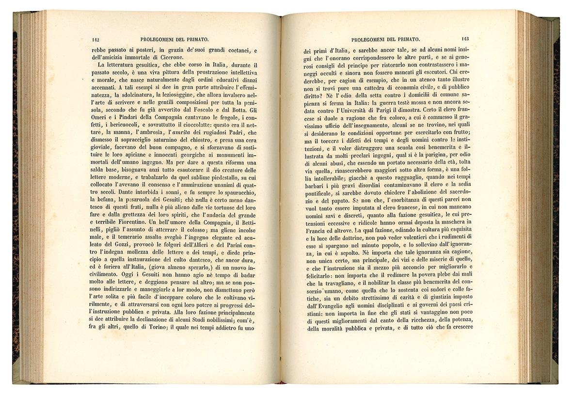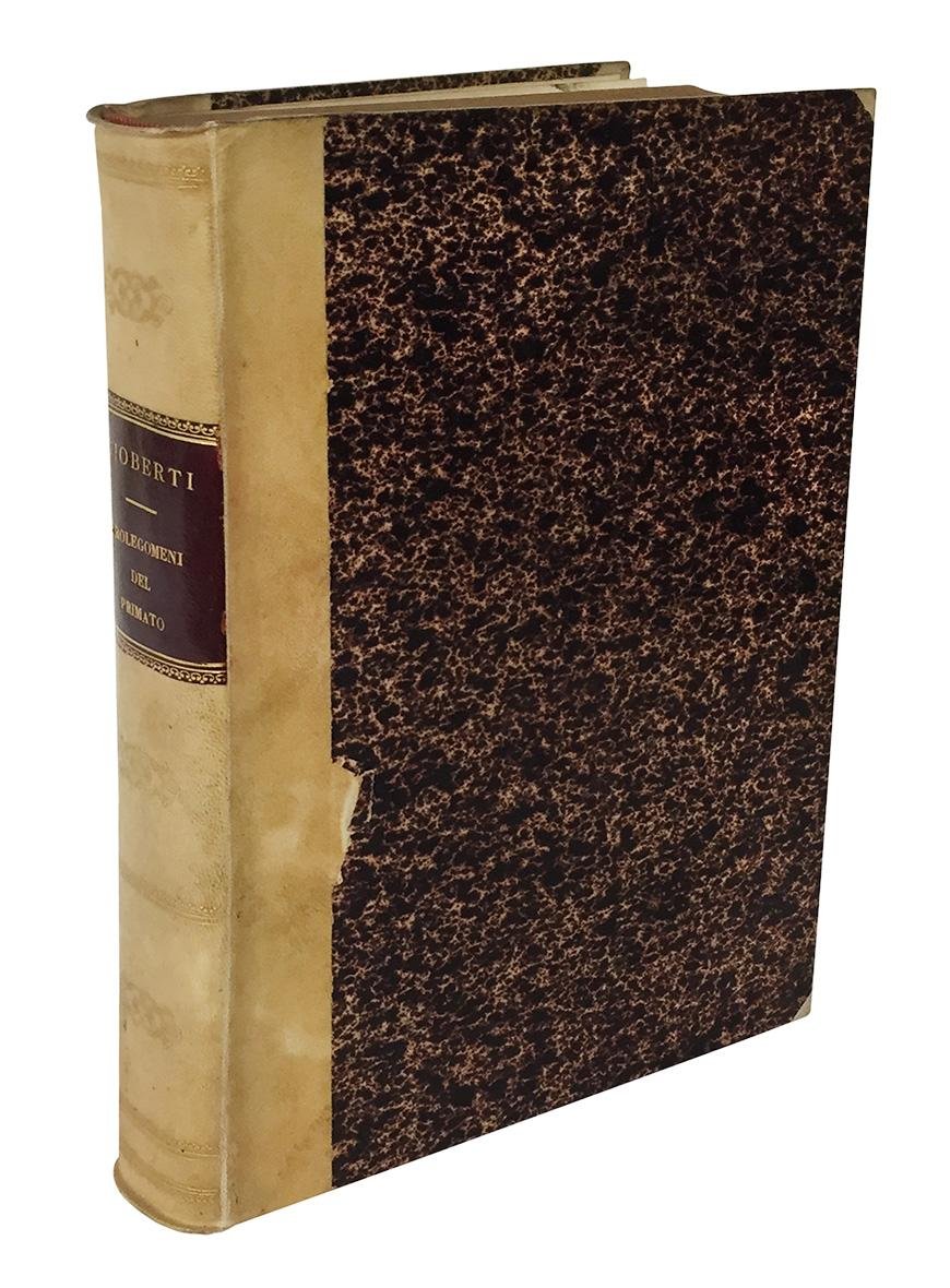 In 8vo (mm 231x148); pp. [4], 448. Occhietto. Lievi fioriture. Piccolo strappo verticale al margine superiore di pagina 17, che tuttavia non comporta la perdita di testo. Mezza pergamena coeva con fregi, filetti e titolo in oro su tassello al dorso. Piatti rivestiti con carta marmorizzata. Tagli spruzzati. Ottimo esemplare di quest'opera fondamentale per lo studio del pensiero giobertiano.