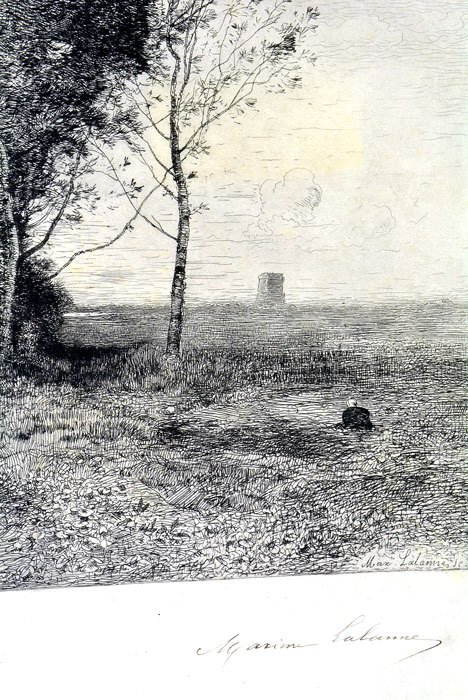 Dimensions 55,5 (49) x 43 (34,5) Cm. Quelques tâches d'humidité. Gravure eaux-fortes sur peau de velin par Maxime Lalanne d'après un tableau de Camille Corot montrant une femme qui se promène dans un paysage automnale. Signé à l'encre par Maxime Lalalle. Gravure en très bon état.