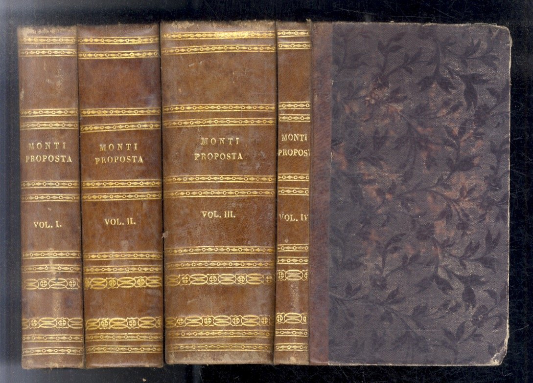 Milano, per Antonio Fontana, 1828-1831, volumi 4, (il primo, il secondo e il terzo divisi in due parti, ma in paginazione continua, il quarto di Appendice), in-12, legatura coeva in mezza pelle, titolo, numero di volume e decorazioni in oro sui dorsi, pp. [2], XIV, 3-53, [4], da 56 a 533, [1] - 718, [2] l'ultima carta bianca, - XI, [1], 928 - [4], 229, [1], la prima carta bianca. Qualche fioritura. Importante opera filologica, tendente a creare una lingua unitaria nazionale viva, inserendo terminologie moderne, per certi versi in contrasto con l'"ortodossia" trecentesca della Crusca.