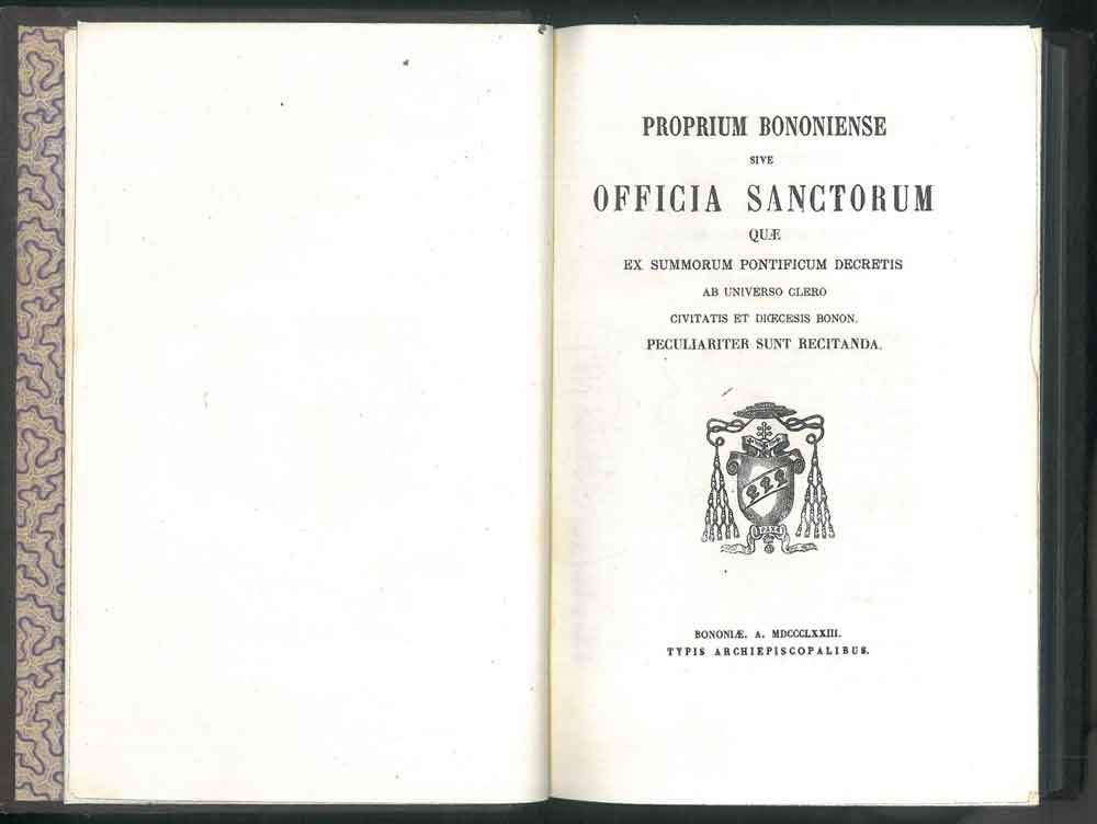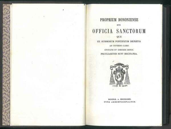 Proprium Bononiense sive Officia Sanctorum quae ex summorum pontificum decretis ab universo clero civitatis et dicecesis bonon. Perculiariter sunt recitanda. - Additamentum ad breviarum romanum exhibens Officia Sanctorum quae recentiores summi pontifices