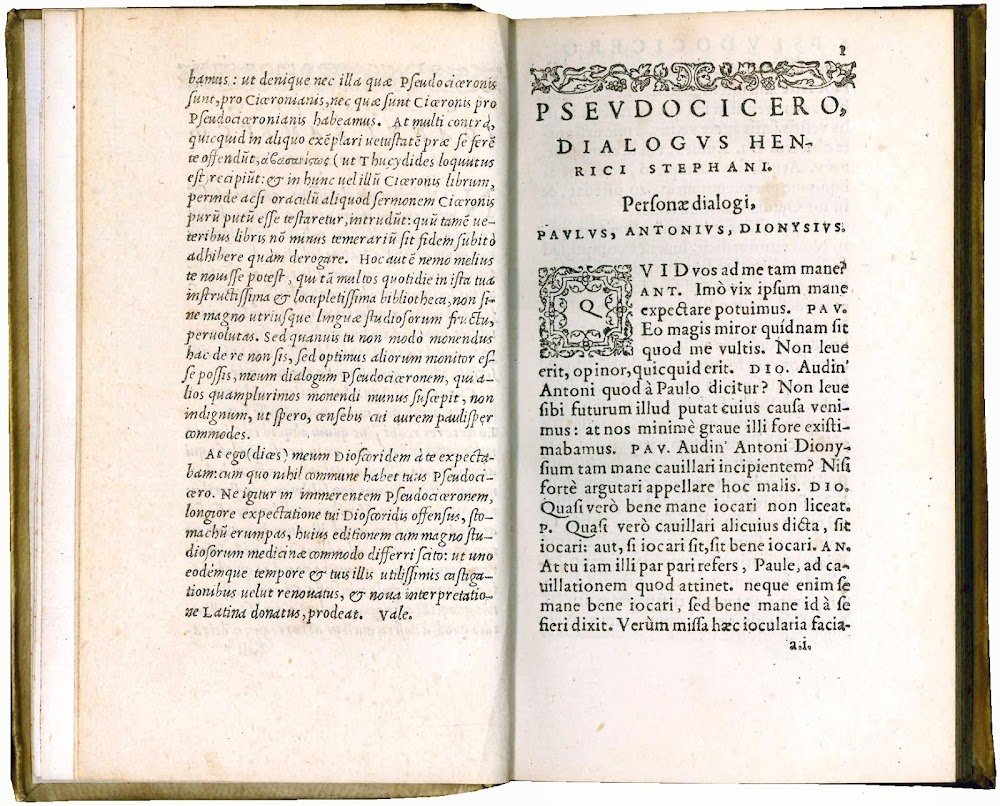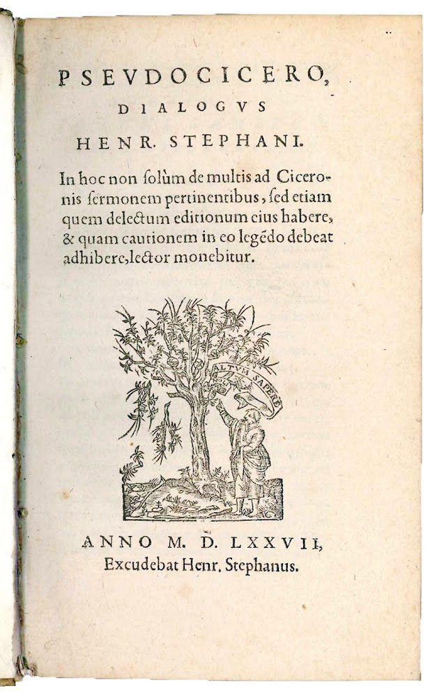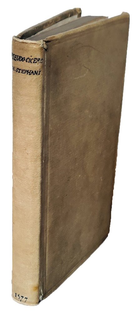 First edition of the second attack of Henri Estienne's on Ciceronianism. The first was published a year previously under the title De latinitate falso suspecta expostulation (with an appendix on the style of Plautus). The last volume of his critic, aimed especially at Mario Nizolio's Thesaurus as a kind of bible of Ciceronianism, appeared as Nizoliodidascalus, sive Monitor Ciceronianorum in 1578.