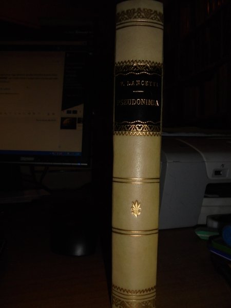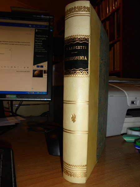 Vincenzo, Lancetti. Milano, Per Luigi di Giacomo Pirola Tipografo-Libraio, 1836. PSEUDONIMIA ovvero Tavole Alfabetiche de' Nomi Finti o Supposti degli Scrittori con la contrapposizione de' veri ad uso de' Bibliofili, degli Amatori della Storia Letteraria e de' Libraj. Edizione Originale. In-8°, m-pergamena con titolo e fregi in oro al dorso. L, 449 pp. Bell' esemplare dell' edizione originale. Neg. mob. 8
