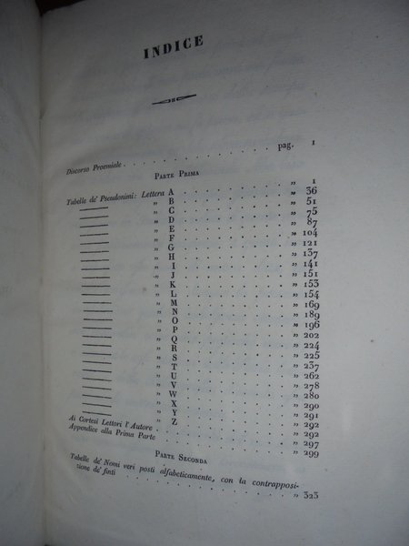 PSEUDONIMIA ovvero Tavole Alfabetiche de' Nomi Finti o Supposti degli Scrittori con la contrapposizione de' veri ad uso de' Bibliofili, degli Amatori della Storia Letteraria e de' Libraj