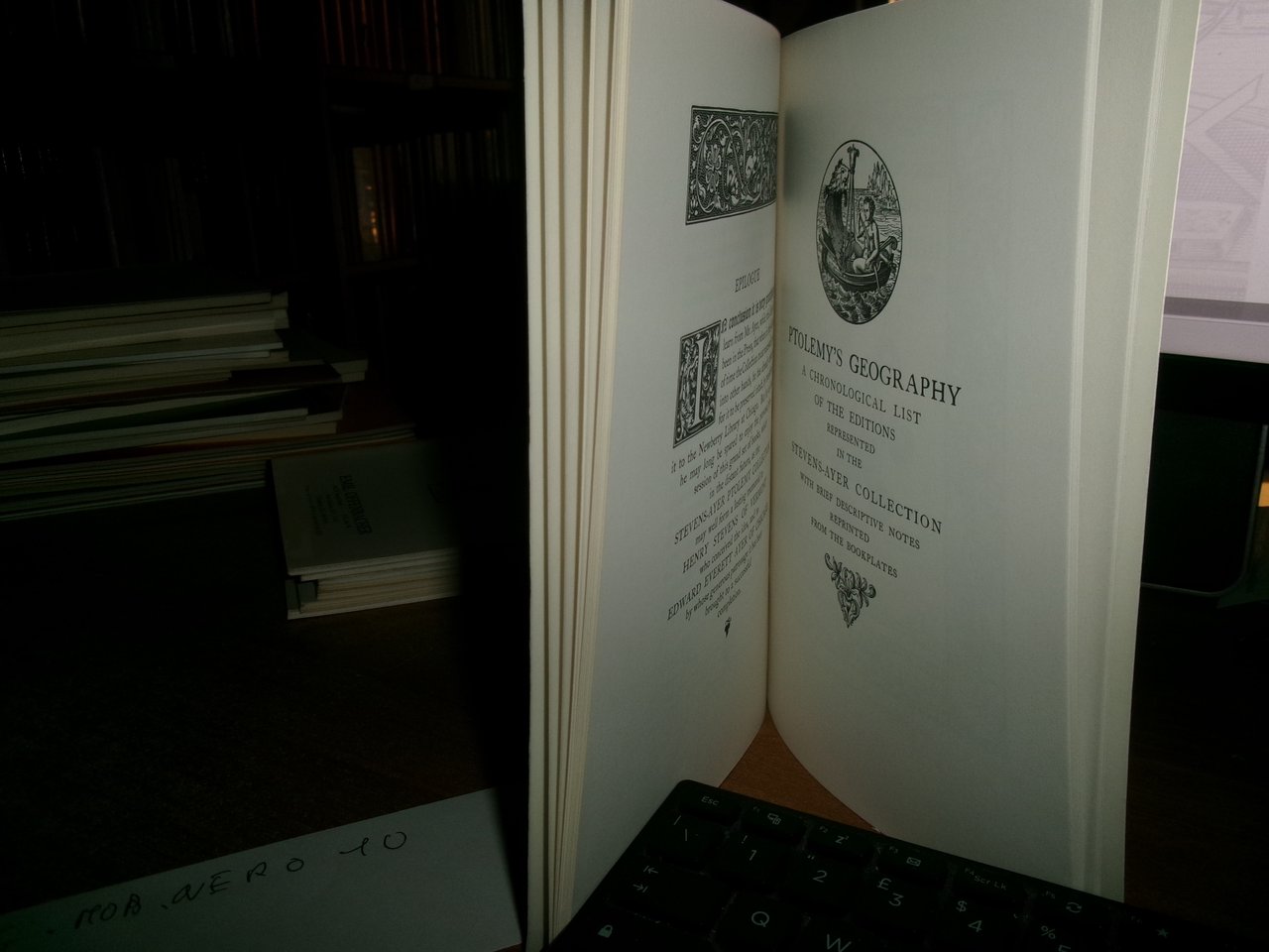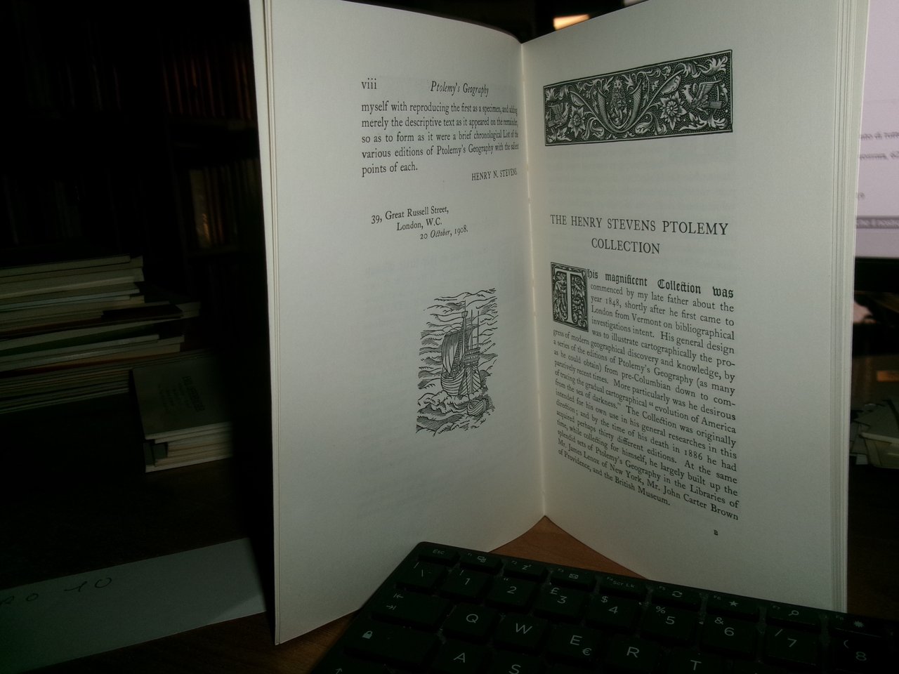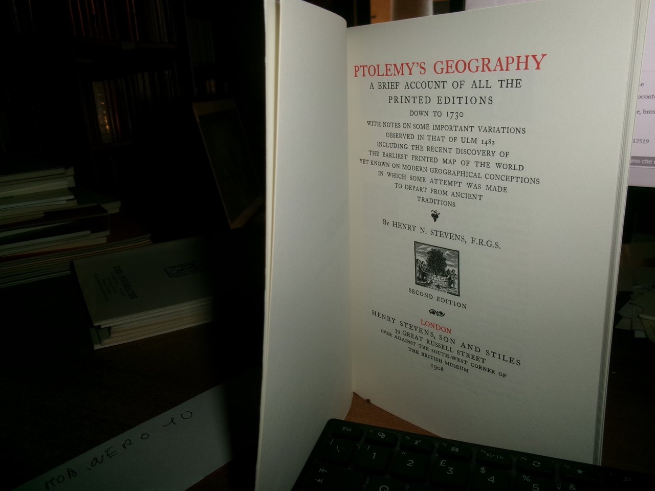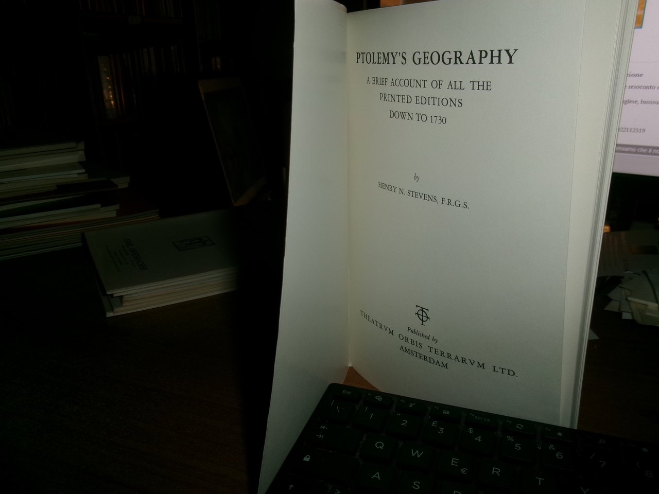 HENRY N. STEVENS. Amsterdam, Published vy Theatrum Orbis Terrarum, 1972. PTOLEMY'S GEOGRAPHY. In-8°, cart. edit. 62 pp. Un breve racconto di tutte le edizioni stampate fino al 1730. Come nuovo con testo in inglese. Neg. mob. nero 10
