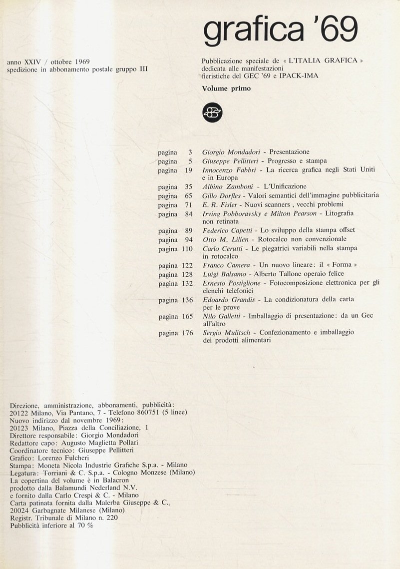 Pubblicazione speciale de “L'Italia Grafica” dedicata alle manifestazioni fieristiche del GEC ‘69 e IPACK-IMA. Anno XXIV.