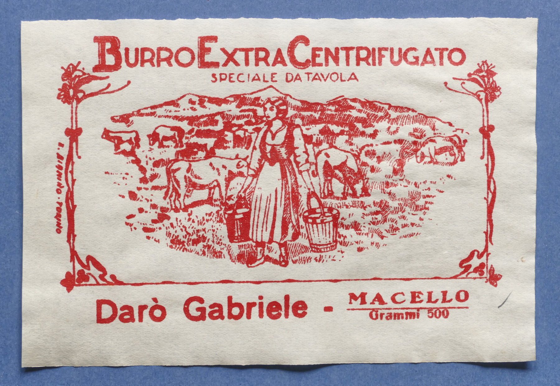 Pubblicità  alimentari Carta confezione Etichetta epoca Burro Extra Centrifugato Darò Gabriele - Macello (Torino) Dimensioni: 10 x 15 cm ca. Condizioni molto buone.