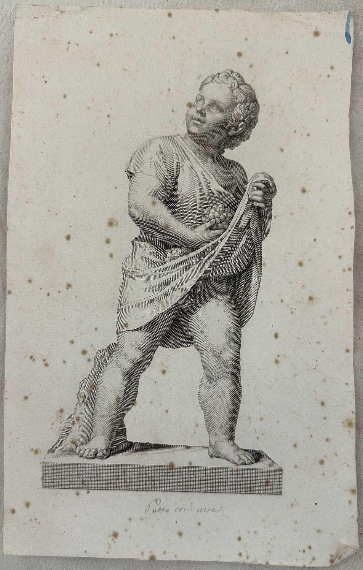 Incisione di un putto con uva. Titolo manoscritto. Autore: Anonimo Data: 1840 circa Tecnica: acquaforte Dimensione del foglio: 27,5x17,5 cm Dimensione dell'incisione: 21x12 cm Condizioni: Buone. Alcune fioriture.Engraving of a putto with grape. Handwritten title Date: 1840 circa Author: anonymous Technique: etching Size of the page: 27,5x17,5 cm Size of the engraving: 21x12 cm Conditions: Goo conditions. Some foxing.