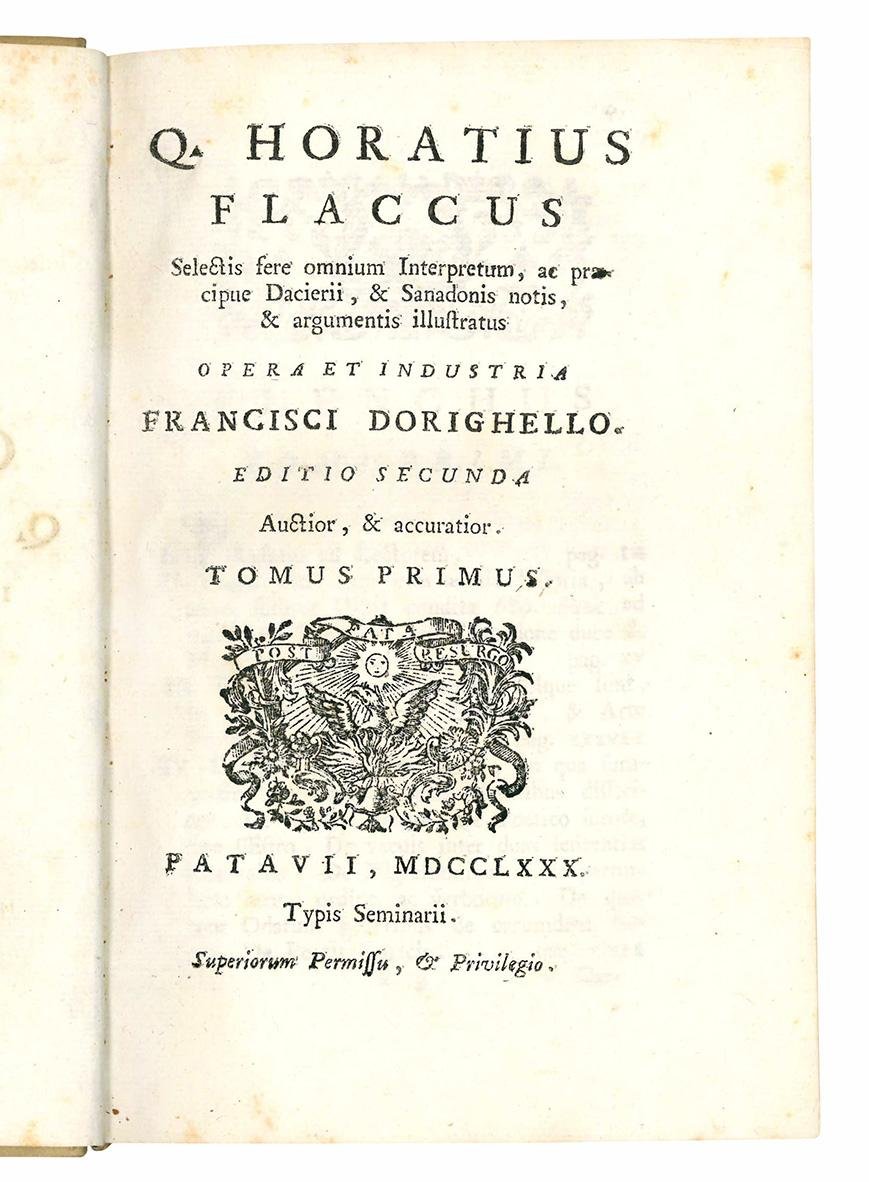 Q. Horatius Flaccus selectis fere omnium interpretum, ac praecipuae Dacierii, & Sanadonis notis, & argumentis illustratus opera et industria Francisci Dorighello. Edition secunda Auctior, & accuratior. Tomus primus [-tertius]