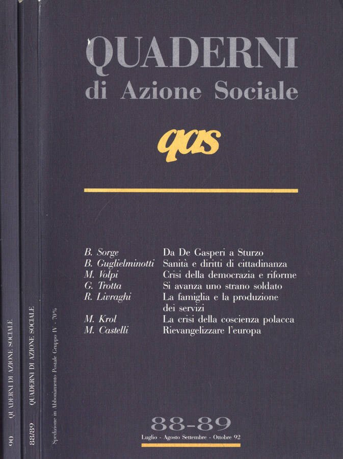 Due volumi brossurati, dei quali uno doppio, dell' anno 1992, in cartoncino flessibile. Pagine in buonissimo stato, leggermente brunite come i tagli. Temi trattati, tra gli altri, nei sommari: Da De Gasperi a Sturzo, di B. Sorge, e La religione in Occidente, di G. Angelini. Numero pagine 351.