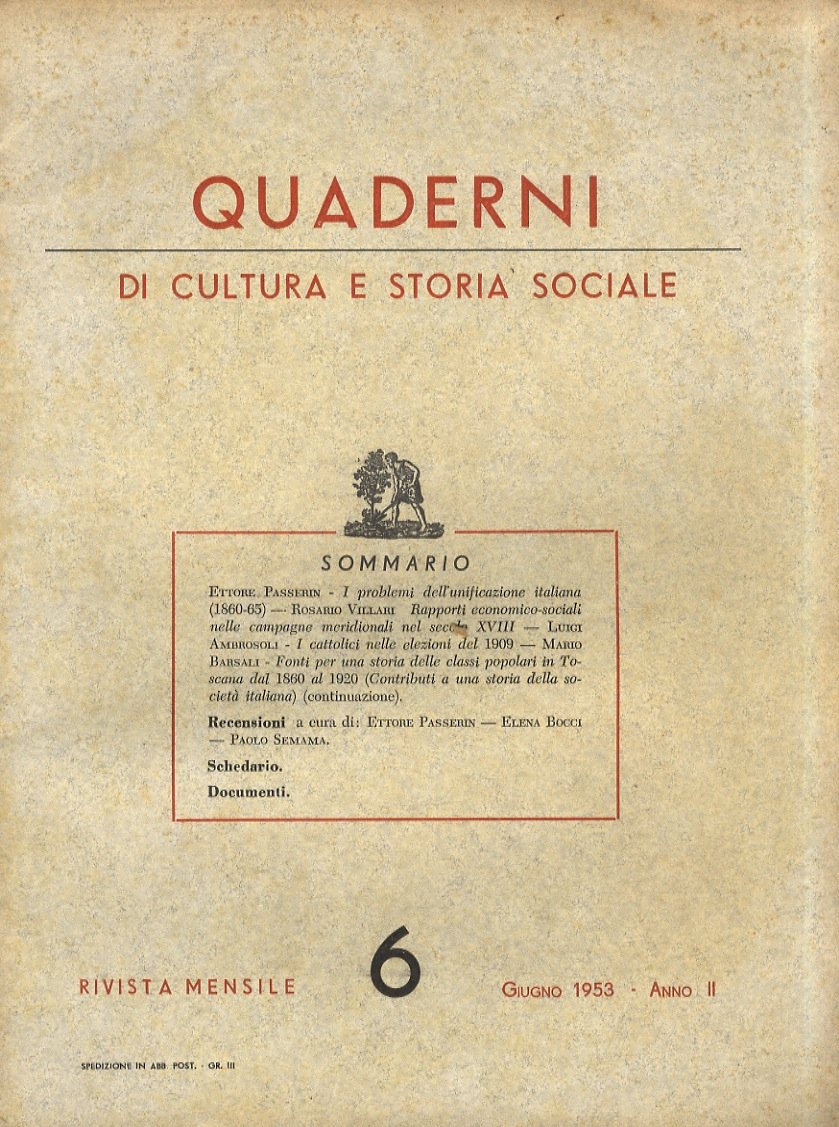 QUADERNI di cultura e storia sociale. Rivista mensile. Anno II. 1953: N. 3-4 (marzo-aprile), n. 6 (giugno).