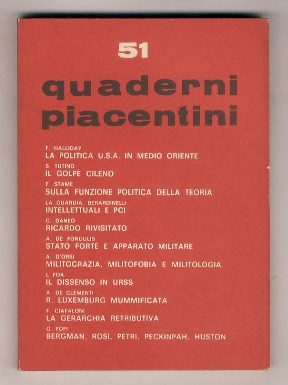 Quaderni Piacentini. Periodo bimestrale. Comitato di direzione: L. Baranelli, B. Beccalli, P. Bellocchio (responsabile), G. Cherchi, F. Ciafaloni, C. Donolo, G. Fofi, E. Masi, M. Salvati, F. Stame. Anno XIII, n. 51.