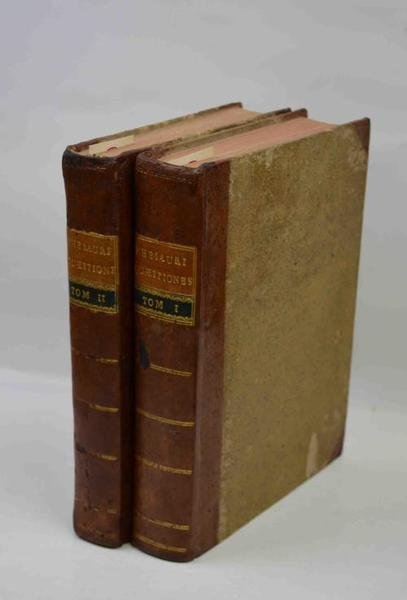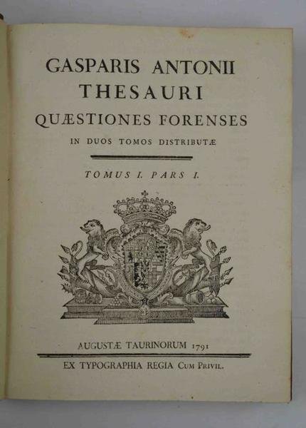Quattro parti in due volumi di cm.25, pp. xi, 690; xv (1) 371 (1); (2) 191 (1). Le prime due parti sono a numerazione continua. Grandi stemmi in xilografia a ciascun frontespizio. Legatura coeva in mezza pelle con punte, dorsi lisci con filetti e titoli in oro su tasselli bicolore. Esemplare genuino ed in ottimo stato di conservazione,