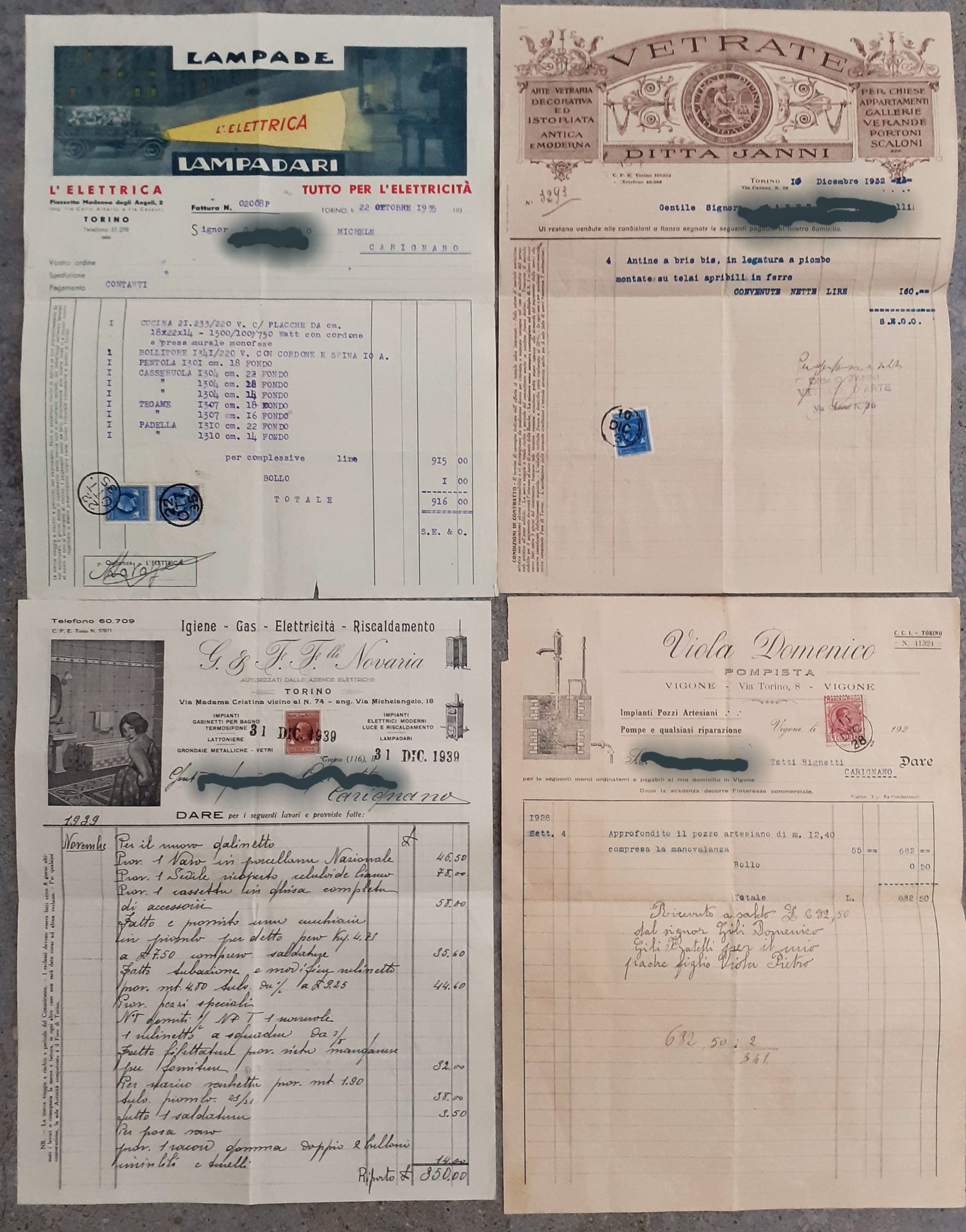 Quattro fatture anni '20 e '30 documenti storici aziendali