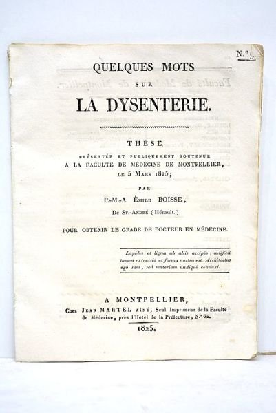 Quelques mots sur la dysenterie. Thèse présentée et publiquement soutenue à la Faculté de Médecine de Montpellier, le 5 mai 1825.