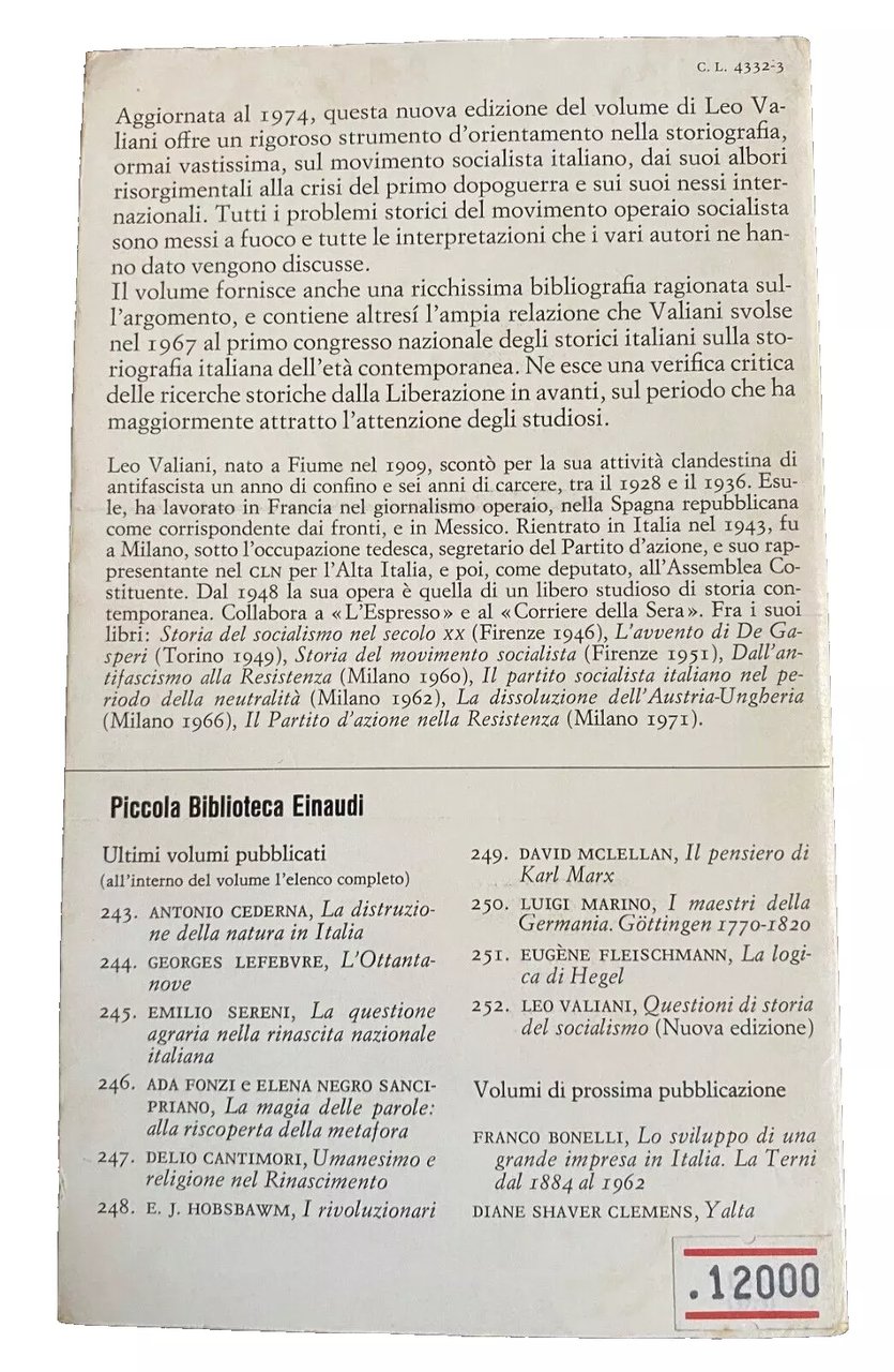 Aggiornata al 1974, questa nuova edizione del volume di Leo Valiani offre un rigoroso strumento d'orientamento nella storiografia, ormai vastissima, sul movimento socialista italiano, dai suoi albori risorgimentali alla crisi del primo dopoguerra e sui suoi nessi internazionali. Tutti i problemi storici del movimento operaio socialista sono messi a fuoco e tutte le interpretazioni che i vari autori ne hanno dato vengono discusse. Il volume fornisce anche una ricchissima bibliografia ragionata sull'argomento, e contiene altresì l'ampia relazione che Valiani svolse nel 1967 al congresso nazionale degli storici italiani sulla storiografia italiana dell'età contemporanea. Ne esce una verifica critica delle ricerche storiche dalla Liberazione in avanti, sul periodo che ha maggiormente attratto l'attenzione degli studiosi.