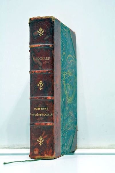 VI. 336 pages. (11x18cm). Demi-basane à coins. Filets dorés. Dos à nerfs orné. Frottements. Quelques manques de cuir au dos et à un mors. Excellent état intérieur. Ex-praemio doré du Collège de Perpignan. Médecin, inspecteur général du Service de santé de la Marine, Rochard tente de sensibiliser ses lecteurs à différents problèmes d'hygiène publique et domestique, en s'appuyant sur plusieurs données concrètes et faits de l'époque, tels que l'organisation maritime de la France coloniale, l'épidémie de choléra de la Mecque, les salaires des ouvriers, le traitement de la douleur, etc. Ceci avec une approche à la fois scientifique, politique, administrative et morale. Table des matières: L'alcool. Son role dans les sociétés modernes. - L'acclimatement dans les colonies françaises. -L'hygiène des villes et les budgets municipaux. - La maison de l'ouvrier. - La douleur. - La crémation. Imprimé sur papier fort.