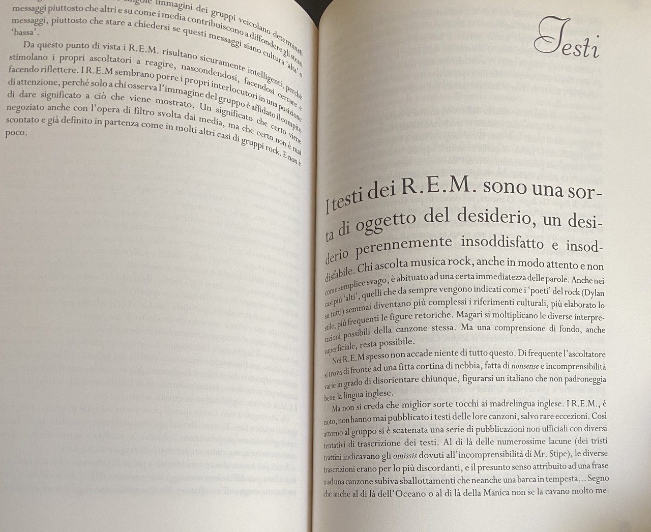 - Band musicali, Band, R.E.M., Gruppi musicali, Biografie, Memorie, Collezionismo, Libri rari, Libri fuori catalogo, Discografie, Discografia, Riferimento, Bibliografia, Interviste, Articoli, Testi musicali, Gruppi, Classifiche, Successi, Musica, Generi musicali, Pop, Punk, Rock, Indie, Underground, Parole, Flusso di coscienza, Citazioni, Traduzioni, Nonsense, Americani, Musicisti, Cantanti, Suono, Palcoscenico, Fenomeni di massa, Concerti, Album, Dischi, Culto, Copertine, Fama, Sottocultura, Trascrizioni, Anni Ottanta, Anni Novanta