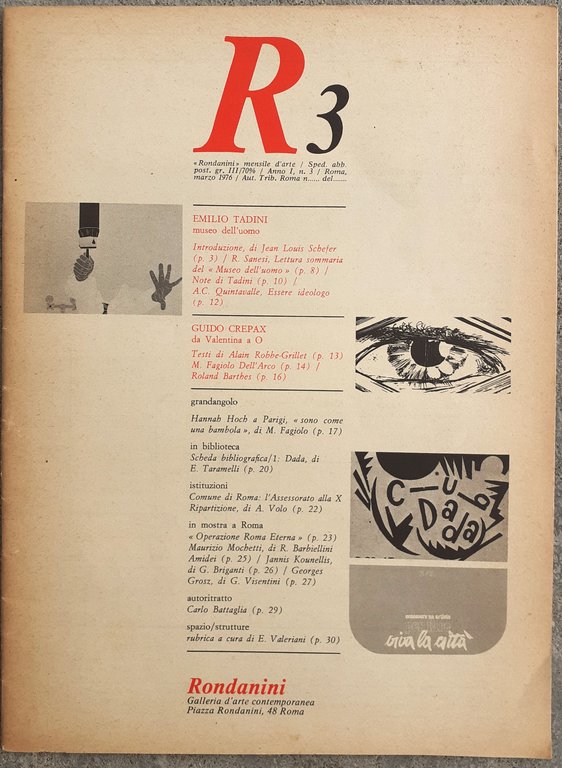 I ed. fuori commercio del mensile d'arte, nonché catalogo della mostra in corso (Rondanini, aprile '76 / Alexander Calder), della Galleria d'arte contemporanea Rondanini (Piazza Rondanini, 48 2002)-R: R3 / "Rondanini" mensile d'arte, Anno I, n. 3, marzo 1976 (Rondanini / 9 marzo '76). Redazione / Ennery Taramelli, Studio Imago, 156 via Urbana. IV piccolo/ 32 (compresa la copertina)/ brossura con titoli in nero e rosso ed illustrazioni in b/n al primo e all'ultimo piatto. Con illustrazioni in b/n nel testo. Stato buono (usura della brossura ai margini - copertina e pagine brunite). Indice: Emilio Tadini, museo dell'uomo (Introduzione, di Jean Louis Schefer / R. Sanesi, Lettura sommaria del "Museo dell'Uomo" / Note di Tadini / A.C. Quintavalle, Essere ideologo) - Guido Crepax, da Valentina a O (Testi di Alain Robbe-Grillet / M. Fagiolo Dell'Arco - Roland Barthes) - grandangolo (Hannah Hoch a Parigi, "sono come una bambola", di M. Fagiolo - in biblioteca (Scheda bibliogrfica/1: Dada, di E. Taramelli) - istituzioni (Comune di Roma: l'Assessorato alla X Ripartizione, di A. Volo) - in mostra a Roma ("Operazione Roma Eterna" / Maurizio Mochetti, di R. Barbiellini Amidei - Jannis Kounellis, di G. Briganti - Georges Grosz, di G. Visentini) - autoritratto (Carlo Battaglia) - spazio/strutture (rubrica a cura di E. Valeriani).