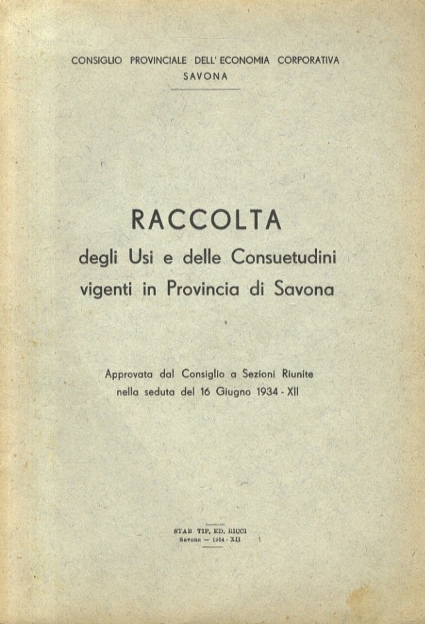 Raccolta degli Usi e delle Consuetudini vigenti in Provincia di Savona. (Usi agrari - Usi commerciali: vini, mosti, liquori, pesci salati, caffè, pepe ed altri coloniali, stracci, carta, ecc. - Usi marittimi).
