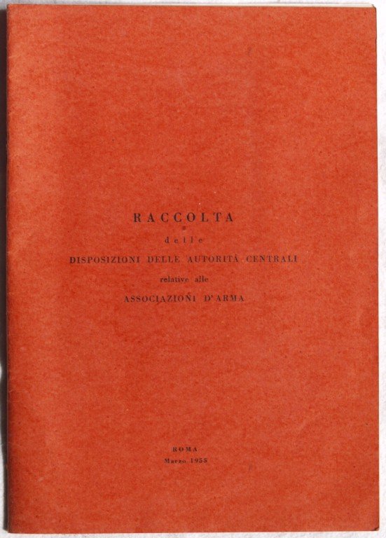 In 8. Dim. 25x17,5 cm. Pp. 12. Interessante pubblicazione del 1955, una raccolta delle disposizioni del Ministero della difesa esercito per le associazioni d'arma. In ottime condizioni. Brossura editoriale in ottime condizioni generali. Rare fioriture. Interesting pamphlet of 1955, a collection of the dispositions of the Ministero della difesa esercito for the army association. In very good conditions. Editorial cover in very good general conditions slightly worn in the edges and spine. Occasioanl foxings.