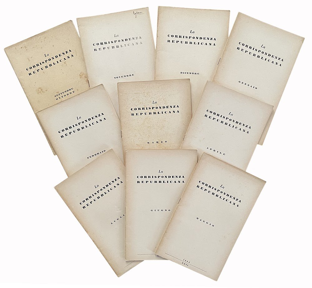 Raccolta di 10 numeri del periodico La corrispondenza repubblicana, pubblicato per la Repubblica Sociale Italiana. Otto fascioli in 8vo (mm 239x147), ognuno contenente circa 20-30 pp. con numerazione continua degli articoli e delle pagine (pp. 67-266). Carta leggermente ed uniformemente brunita. Tiratura graffettata senza brossura editoriale ab origine. Ottimi esemplari.