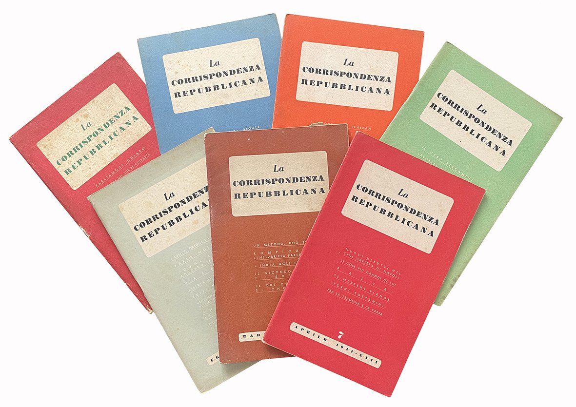Raccolta di 7 numeri del periodico La corrispondenza repubblicana, pubblicato per la Repubblica Sociale Italiana. Otto fascioli in 8vo (mm 239x147), ognuno contenente circa 20-30 pp. con numerazione continua degli articoli e delle pagine (pp. 67-266). Carta leggermente ed uniformemente brunita. Brossure editoriali bicrome. Ottimi esemplari.