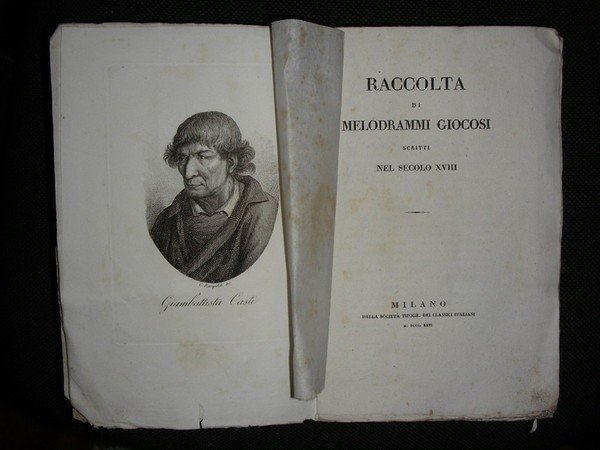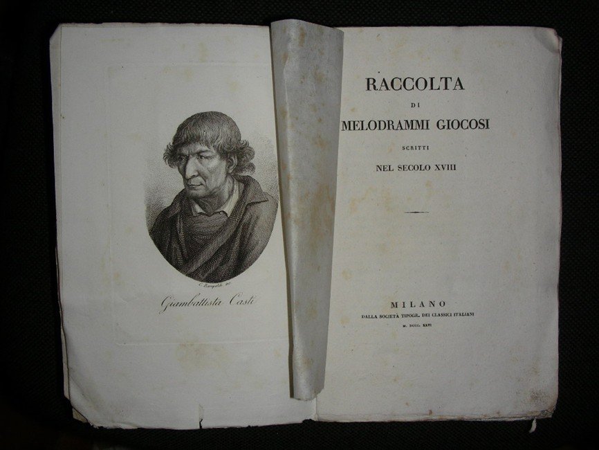 gr. vol. in-8, pp. XVI, 673, (2), bross. edit. con cornici xilogr. ai piatti. Con ritr. del Casti in antip. Sono raccolte opere di G. Gigli, P. Metastasio, C. Goldoni, G. P. Casti, Ranieri de' Calsabigi, G. B. Lorenzi. [MM23-435]