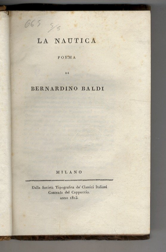 Raccolta di poemi didascalici. [1]: La nautica poema di Bernardino Baldi. [2]: Della sifilide, ovvero del morbo gallico di Girolamo Fracastoro libri tre volgarizzati da Vincenzo Benini Colognese a cui si aggiungono alcune annotazioni [3]: La coltivazione del riso del marchese Giambattista Spolverini colle varie lezioni del medesimo.