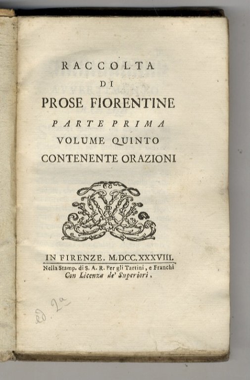 Raccolta di Prose Fiorentine. Parte Prima. Volume Quinto contenente Orazioni.