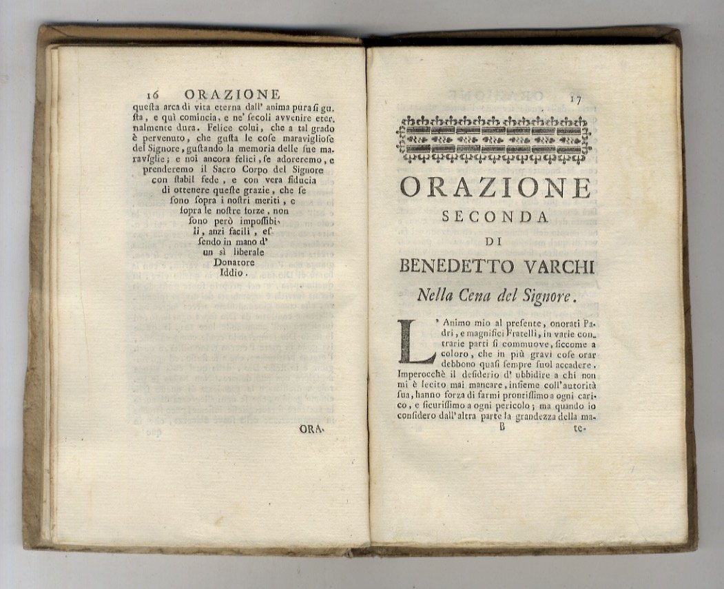 In Firenze, Nella Stamperia di S.A.R. per gli Tartini e Franchi, 1738, in-8, cartone rustico coevo con titolo manoscritto al dorso, pp. XXXXI, 223, (1). Con testate, finali ed iniziali xilografici. Testi a carattere religioso o agiografico (lodi di S. Filippo Neri, lodi di S. Benedetto, lodi di S. Antonio, della decollazione di San Giovanbatista) di Lorenzo Giacomini, Benedetto Varchi, Benedetto Buommattei, Alessandro Strozzi, Carlo Dati, Gio. Batista Borgherini, Alessandro Segni, Vincenzio da Filicaja, Lodovico Adimari. Un solo volume (su 6), ma in se completo. Ottime condizioni.